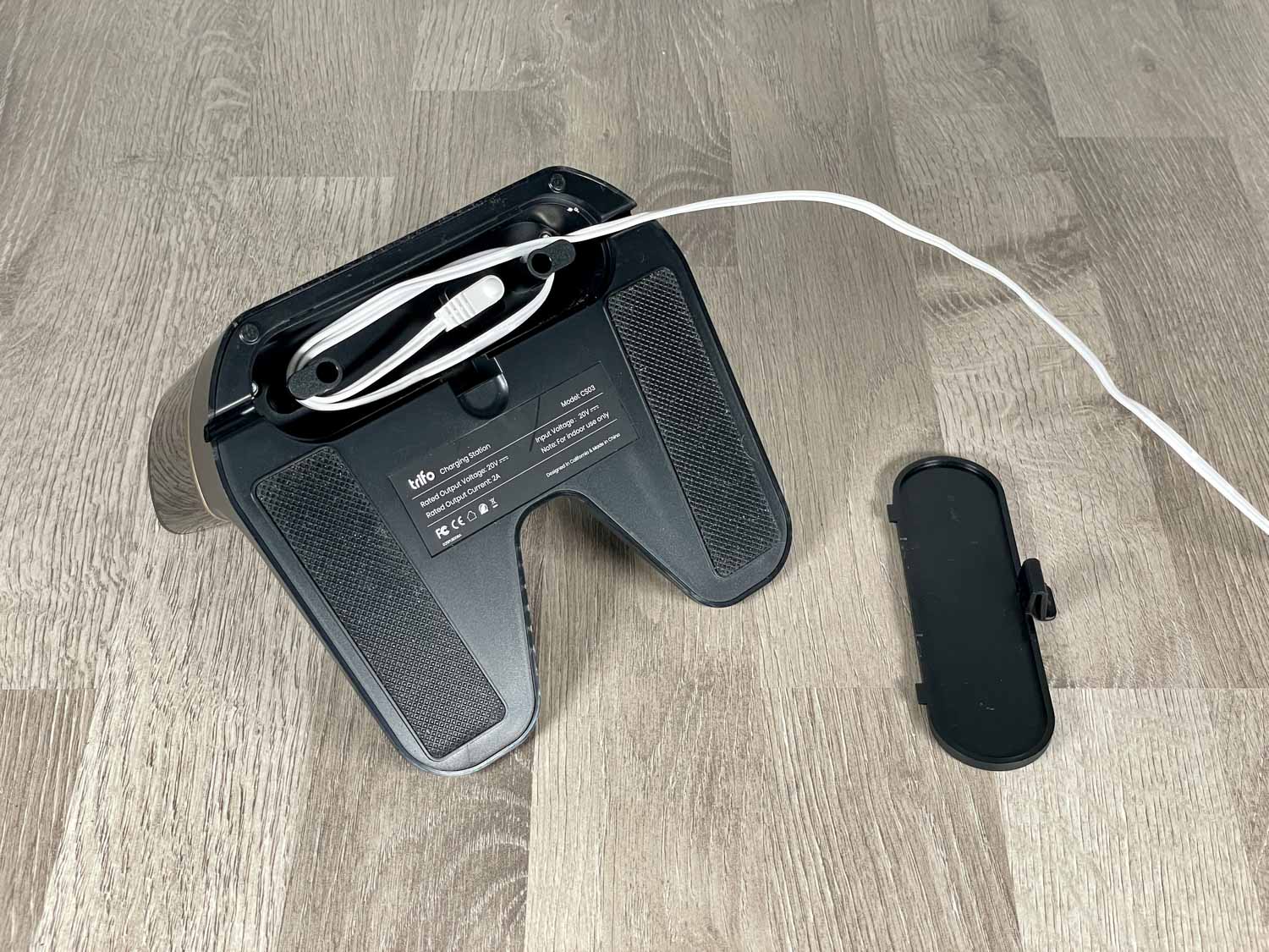 Die Ladestation ist einfach und zweckmäßig gehalten. Hier kann man nicht viel zu sagen. Auf der Unterseite befindet sich eine verschließbare Mulde, in der überschüssiges Kabel aufgewickelt werden kann. So spart man sich herumliegendes Kabel und der daraus resultierende Kabelsalat. Die Ladestation summt ein wenig, was für eine Nutzung im Schlafzimmer ungeeignet ist.