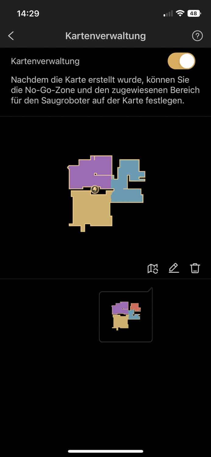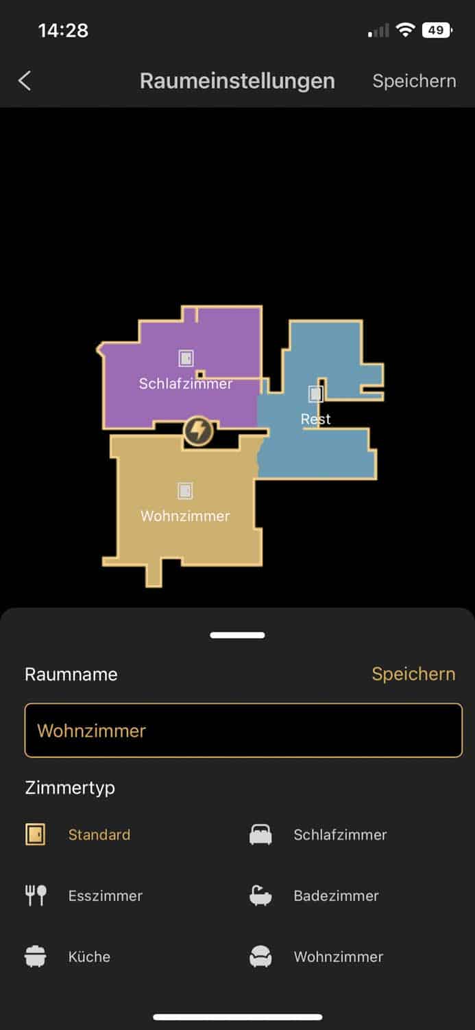 | Raumeinteilung | Die Karte wird vom Roboter in einzelne Räume aufgeteilt. Diese können nicht manuell bearbeitet werden. |