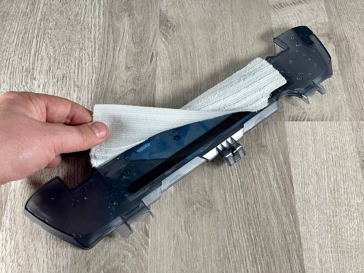 Die Wischplatte ist vom Volumen her unglaublich klein bemessen. Auch die Wischtücher, die ich nur für eine einmalige Verwendung nutzen würde, sind sehr dünn und klein bemessen. Die Wischplatte besitzt keine Wasserpumpe, sondern gibt das Wasser über einfache Wasserfilzfilter ab. Somit handelt es sich hierbei um eine passive Wischfunktion, was absolut nicht mehr zeitgemäß ist. Die Wischplatte wird überraschenderweise, genauso wie die Wischtücher an die Platte, über Klett am Roboter befestigt. Dafür muss man den Roboter umständlich umdrehen.