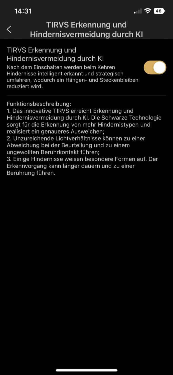 | KI-Erkennung | Die intelligente Hinderniserkennung inklusive Erstellung von Piktogrammen kann aktiviert oder deaktiviert werden. |