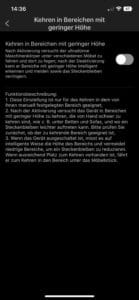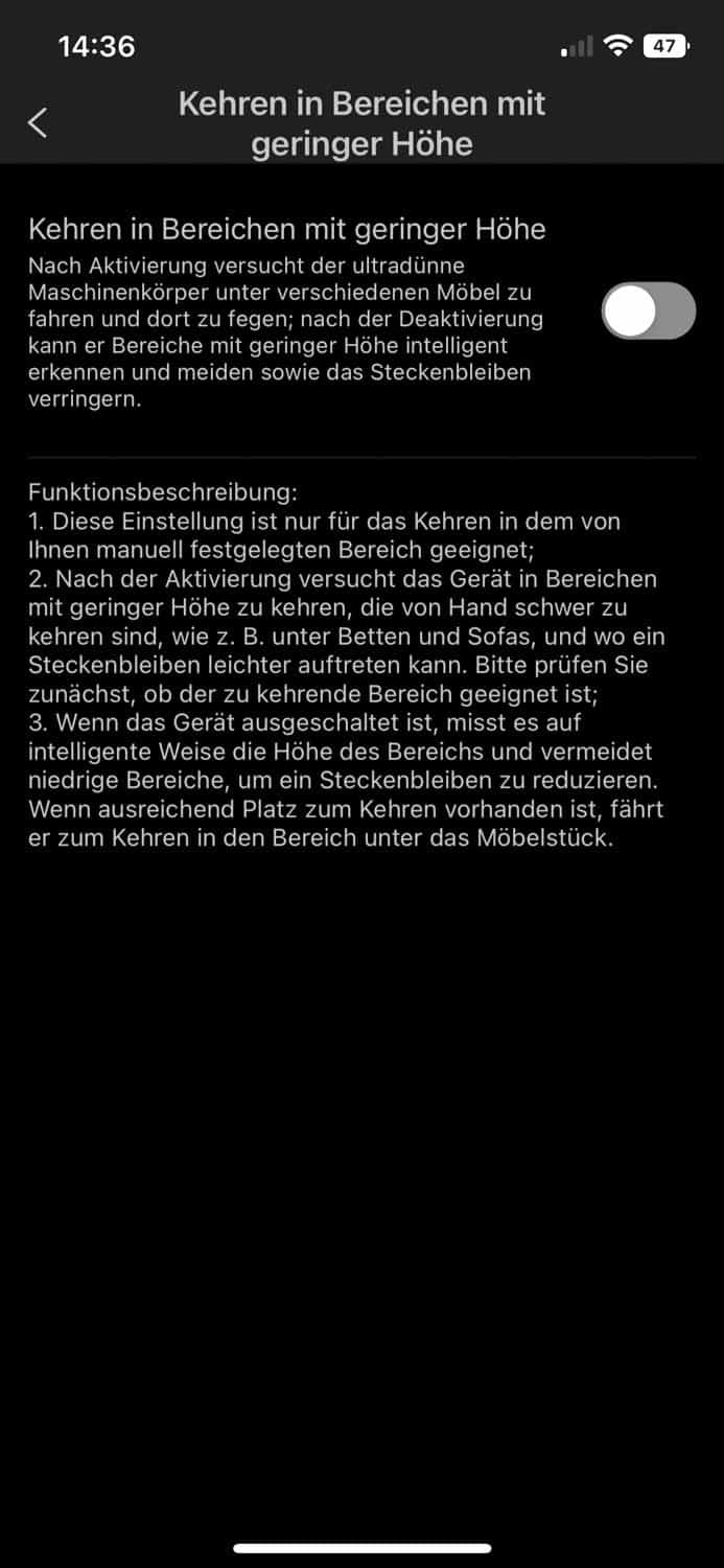 | Geringe Höhe feststellen | Die Kamera kann Möbel mit unsicherer Höhe erkennen und meiden. Das kann man aktivieren oder deaktivieren. So bleibt der Roboter seltener stecken. |
