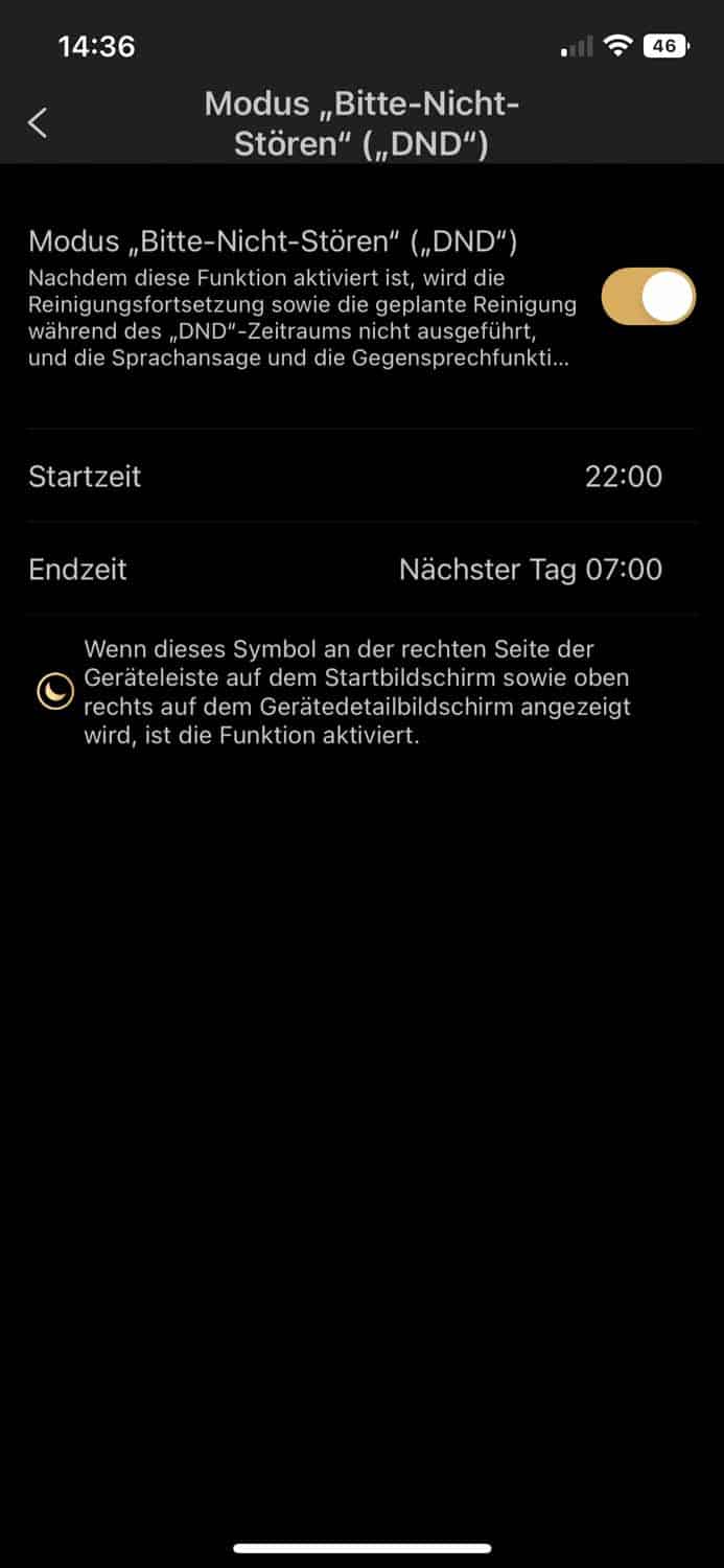 | DND-Mode | Ist dieser aktiviert, führt der Roboter keine abgebrochenen oder geplanten Reinigungen fort. |
