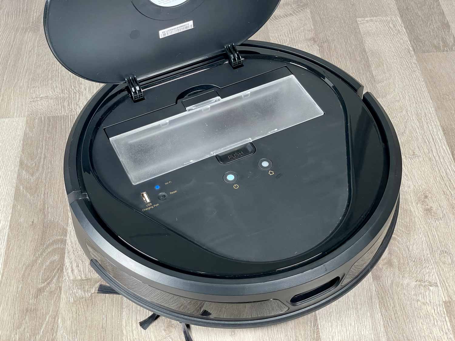 Unter der Haube, die sich einfach von vorn heraus aufklappen lässt, befindet sich der 600 Milliliter große Staubbehälter, der mit einem einfachen Klick herausgenommen werden kann. Zudem gibt es einen Resetknopf und eine WiFi-Anzeige. Was ich so noch nie gesehen habe in einem Saugroboter, ist der verbaute USB-Charging-Port, der sich neben dem Resetknopf befindet. Der Nutzen davon ist mir etwas schleierhaft, denn wer lädt denn sein Smartphone an seinem Saug-Wischroboter auf?
