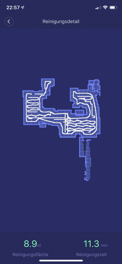 In meinem Test hat sich gezeigt, dass der Viomi V2 eine extrem feinfühlige Orientierung an den Tag legt. Er stoppt immer vor jedem Hindernis, egal wie dünn oder dunkel dieses ist. Das Einzige, was ihn ein wenig langsam werden lässt, ist das seitliche Abfahren von Gegenständen. Durch das Fehlen eines Wandabstandssensors fährt er wirklich sehr langsam und behutsam an jedem Gegenstand vorbei, was die Reinigungsdauer leider sehr in die Länge zieht. Im Vergleich mit dem Xiaomi Mi Robot Vacuum, der einen Bereich von 15 qm in knapp 14 Minuten bewältigen kann, benötigt der Viomi V2 ganze 21 Minuten dafür. Außerdem überlappt er die Bahnen so sehr, dass er sie beinahe dreimal abfährt. Auch das verlängert die Reinigungsdauer erheblich.