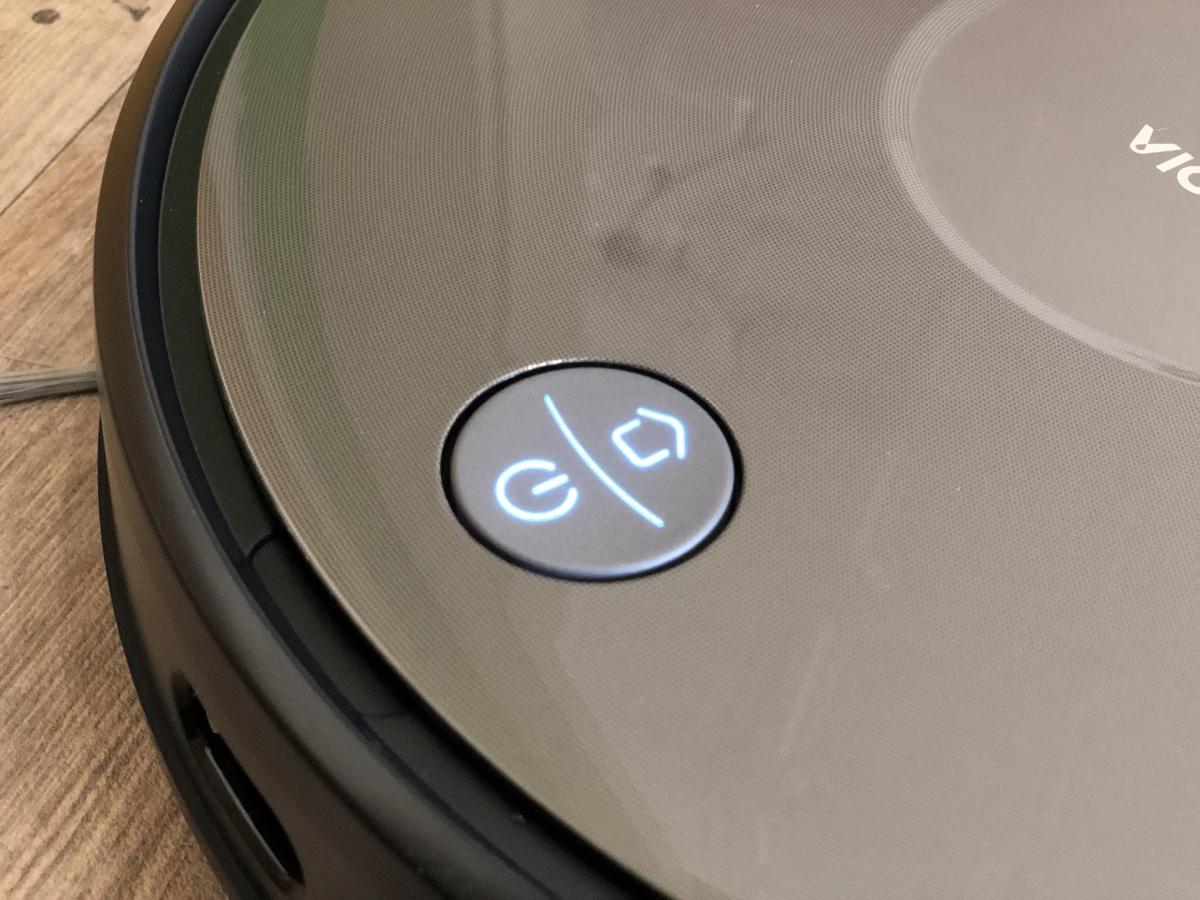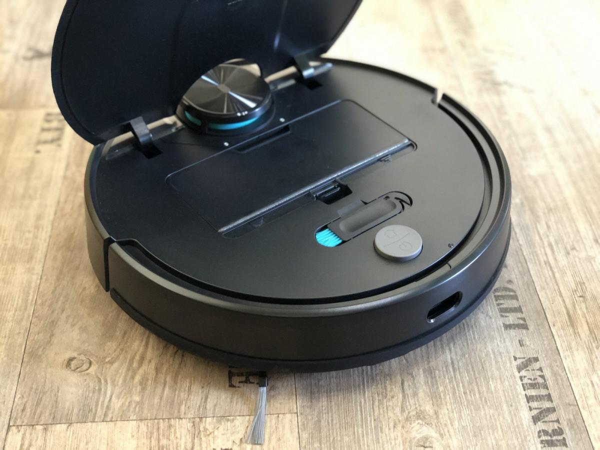 Auf seiner Oberseite befindet sich ein Schalter, mit dem man den Roboter starten, pausieren oder zur Ladestation zurückschicken kann. Unter seiner Klappe befindet sich der recht große Staubbehälter, der einfach mit dem gleich großen Wassertank ausgetauscht werden kann. Außerdem wurde noch ein praktisches Reinigungstool in den Roboter eingelassen. Das Gerät hat einen Durchmesser von 33 cm und weist eine geringe Höhe von 9,5 cm auf. Sein Deckel verfügt über eine Musterung und der Laserturm strahlt in einem außergewöhnlichen und CD ähnlichen Metalldesign, was das Gerät sehr hochwertig erscheinen lässt. Auf der Unterseite findet man die hellblaue Bürste und die nicht zu weiche Seitenbürste. Auch erkennt man die kleinen Löcher, die das Wasser auf das Wischtuch ausgeben.