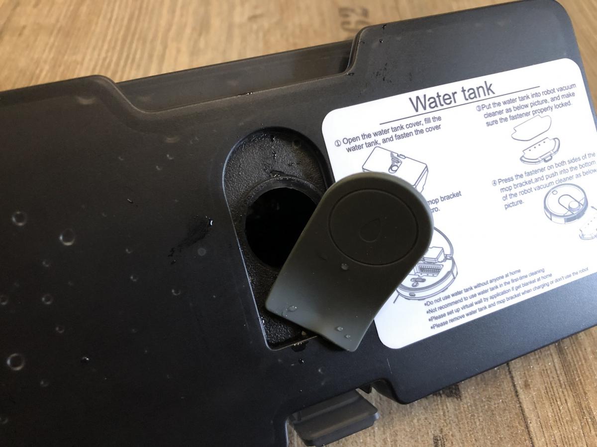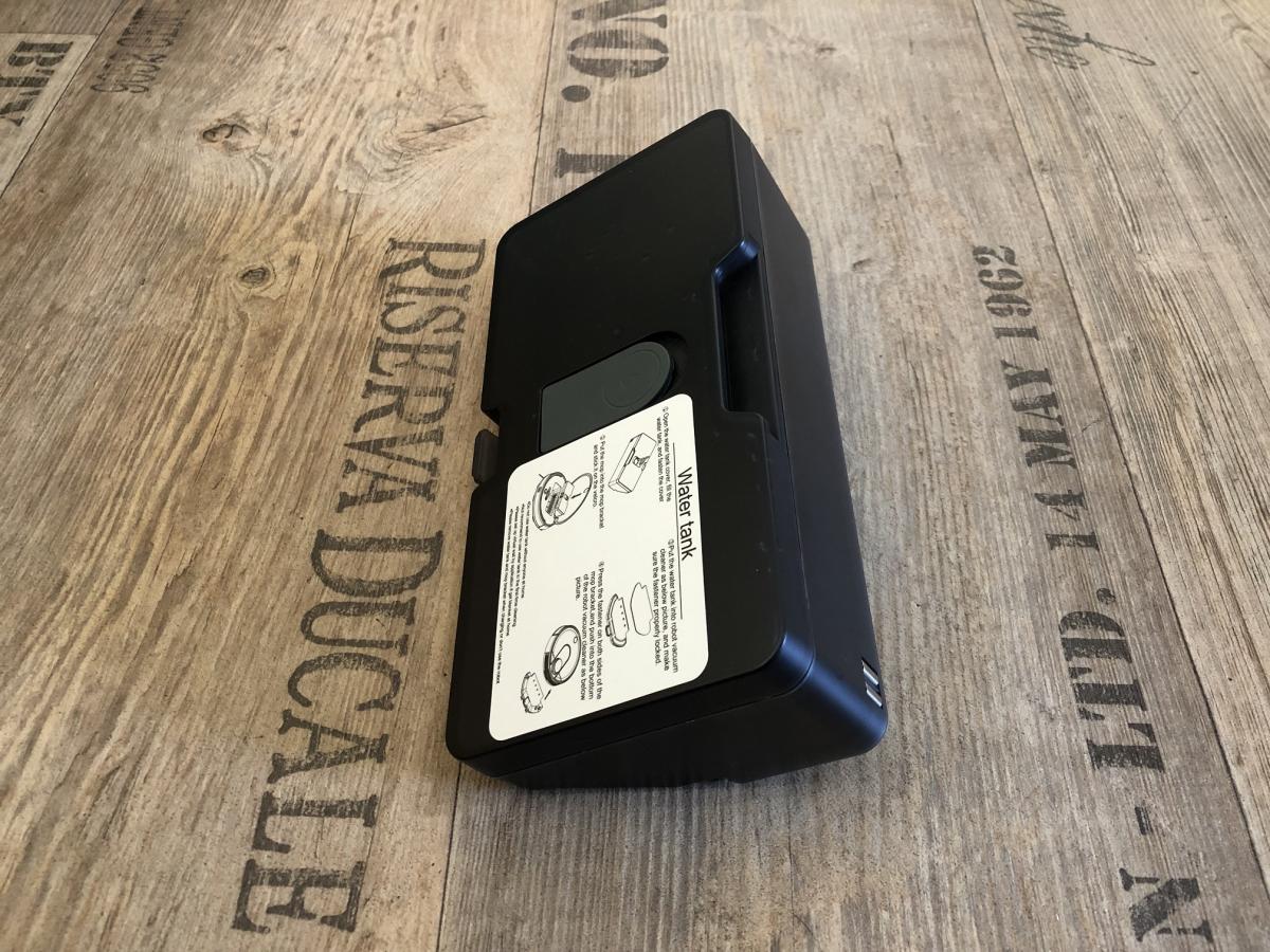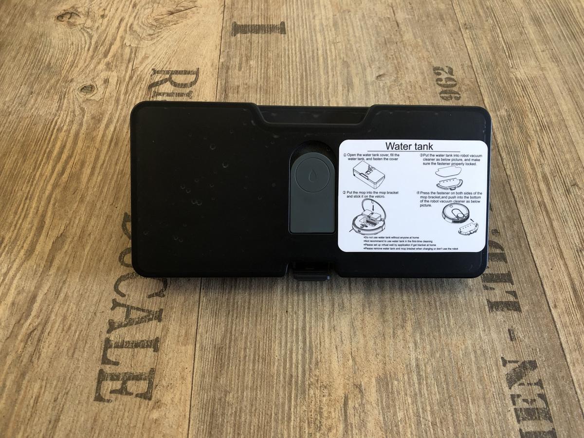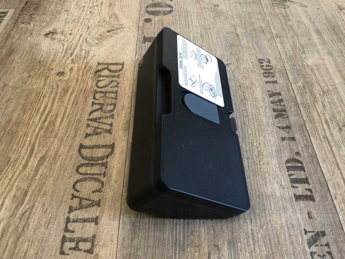 Der schwarze und 0,6 Liter große Wassertank ist einfach mit dem Staubbehälter austauschbar und bringt genügend Wasser auf das Wischtuch aus. Durch die auf der Unterseite angebrachten Löcher fließt das Wasser direkt auf das Tuch. Der Wassertank ist mit einer Gummidichtung verschlossen und lässt sich mit normalem Leitungswasser befüllen. Im befüllten Zustand tropft dieser gelegentlich mal.