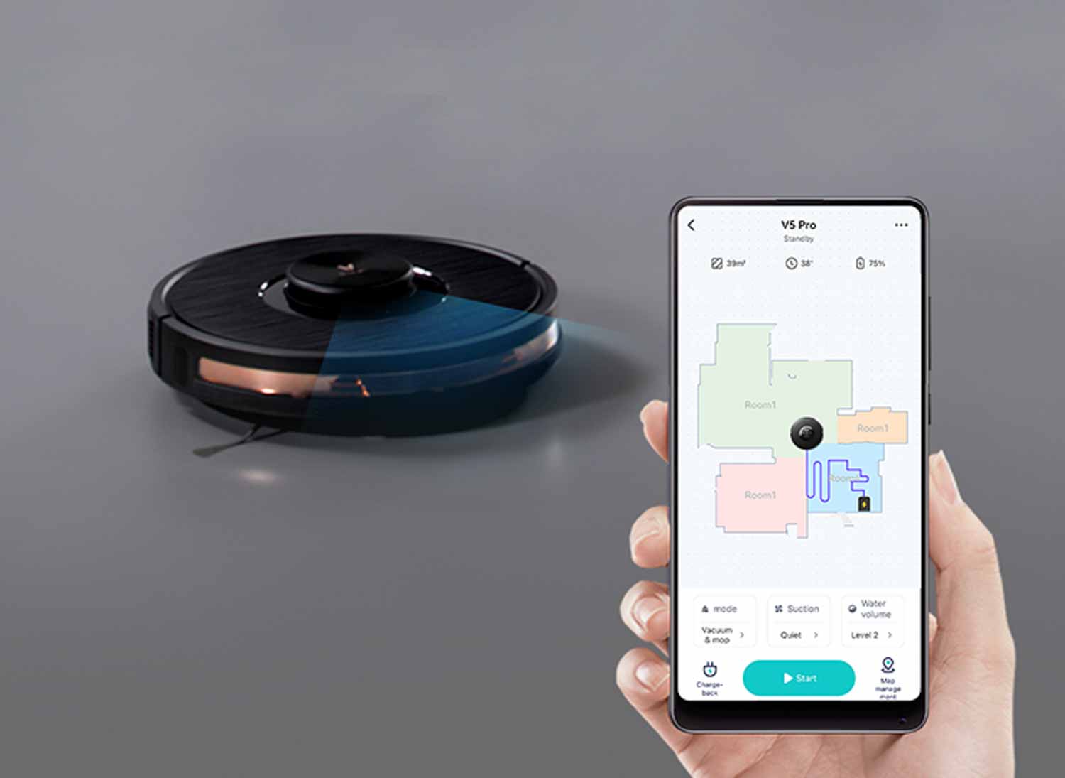 Auch der Viomi V5 Pro wird abermals, wie alle anderen Viomi-Modelle, in die Xiaomi Home App eingepflegt. Diese verleiht dem Roboter erst die wahre Funktionsvielfalt. Die vom Roboter gescannte Karte wird in einem detailreichen Umriss in der App wiedergegeben. Ebenfalls wird diese in verschiedene Zimmer eingeteilt, die in Leistung und Erscheinung manuell angepasst werden können. Der Viomi V5 Pro kann zudem auf verschiedenen Etagen eingesetzt werden, da er mehrere Karten speichern kann. Wer seinen Viomi V5 Pro gemütlich über die Sprache starten oder stoppen möchte, der hat die Möglichkeit über Amazons Alexa oder Googles Assistenten, dies zu tätigen. Der Viomi V5 Pro kann mit beiden externen Sprachassistenten umgehen.