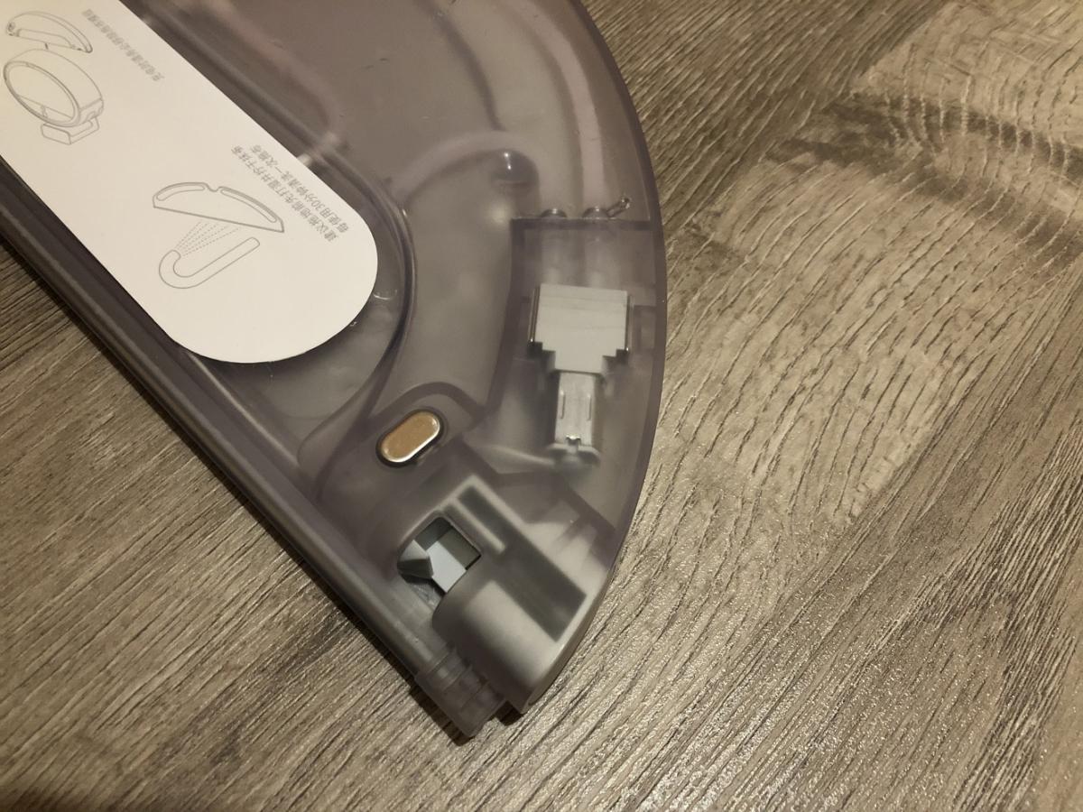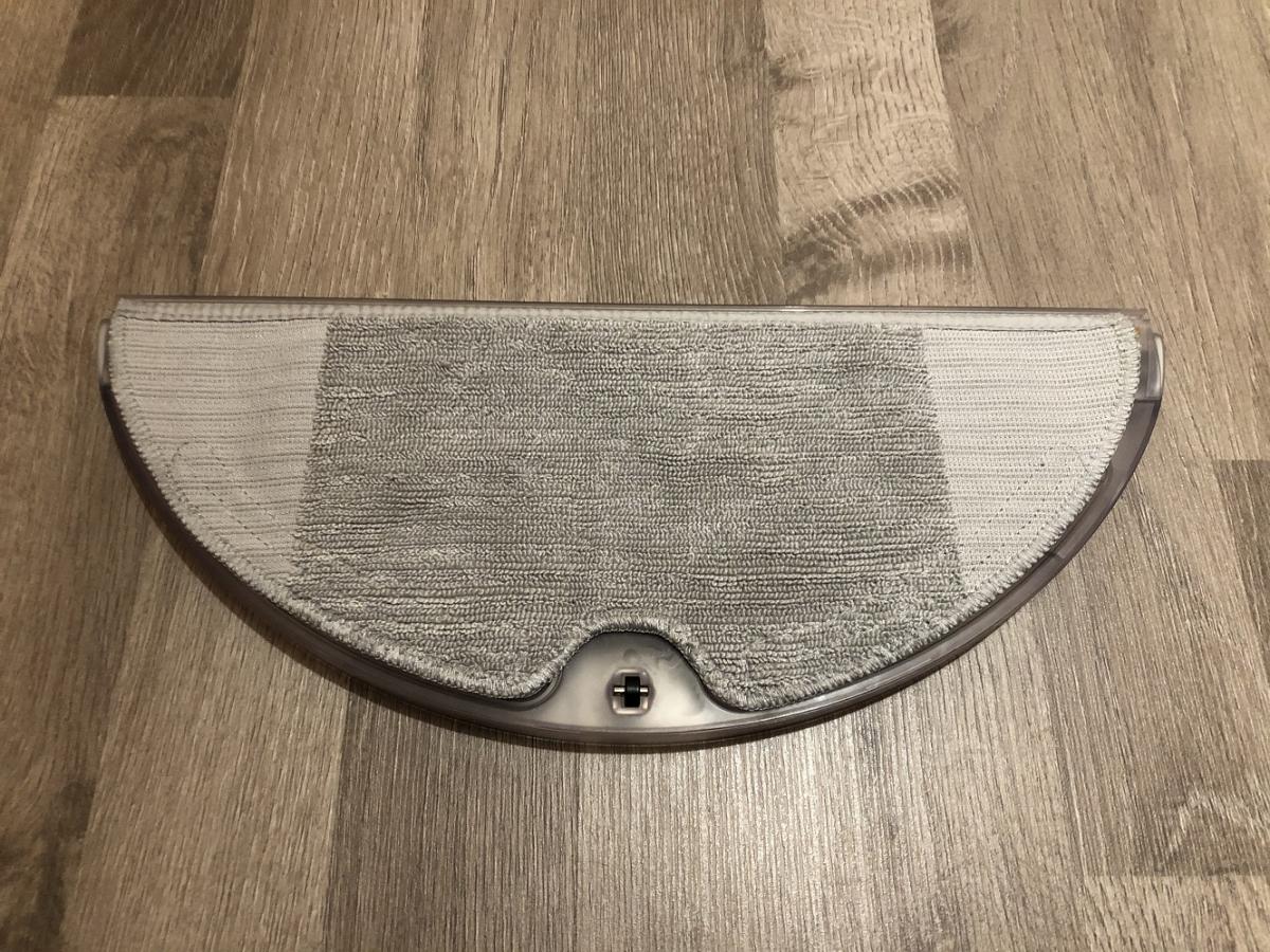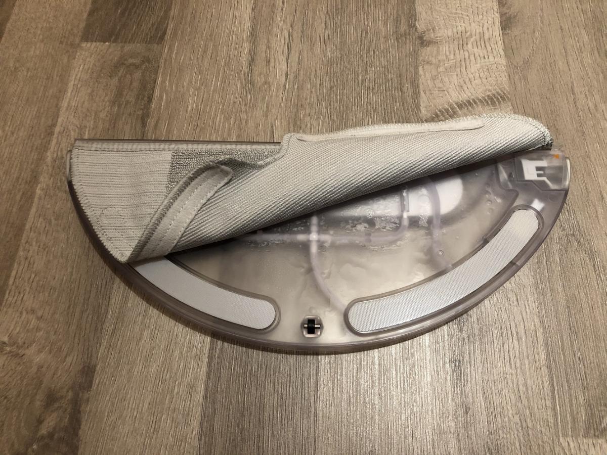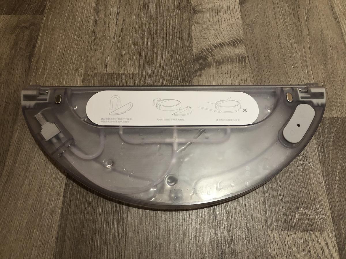 Der Wassertank besteht aus einem mattem und transparentem Kunststoff. Er sieht aus wie ein Halbkreis und wird einfach unter den Roboter geschoben, bis er einrastet. Die Besonderheit dieses Tanks ist die eingebaute Pumpe. Diese gibt das Wasser kontinuierlich in gleichen Mengen auf das Wischtuch ab, was zu einem besseren Wischbild führt. Auf der Unterseite ist das mitgelieferte Mikrofasertuch anzubringen. Das zieht man einfach in eine Art Halterung und klettet es an.