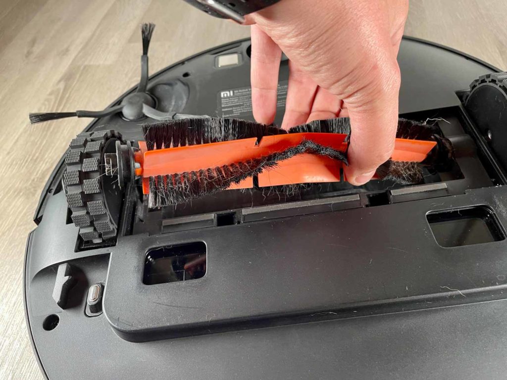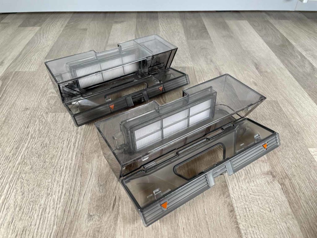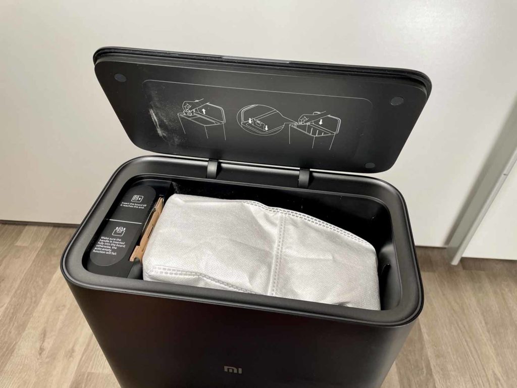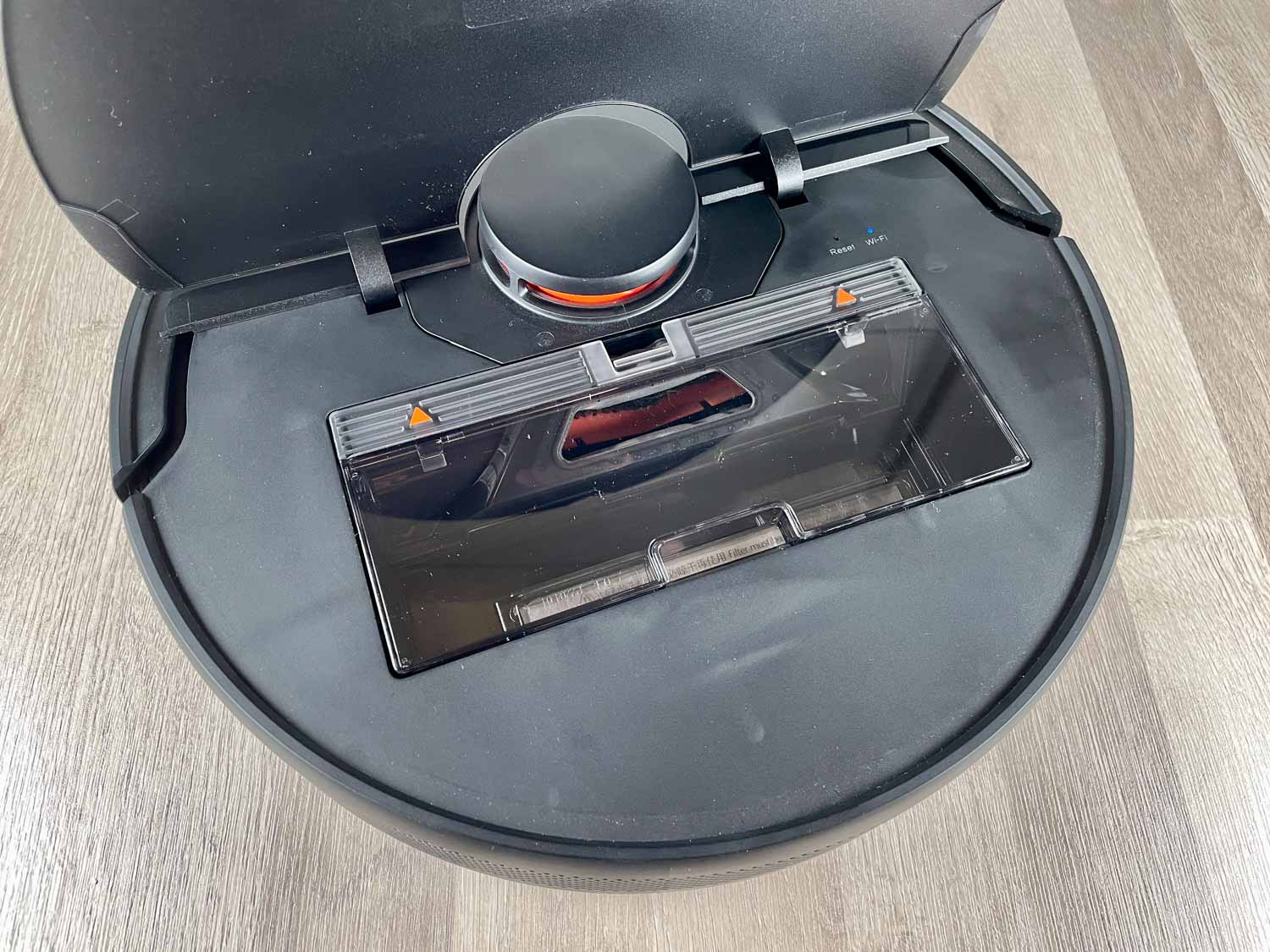 Unter der Haube findet man den großen und vollständig transparenten Staubbehälter, gefolgt von einer WiFi-LED und einem Resetknopf. Auf ein eingebettetes Reinigungstool hat Xiaomi hier verzichtet. Dieses muss separat untergebracht werden.