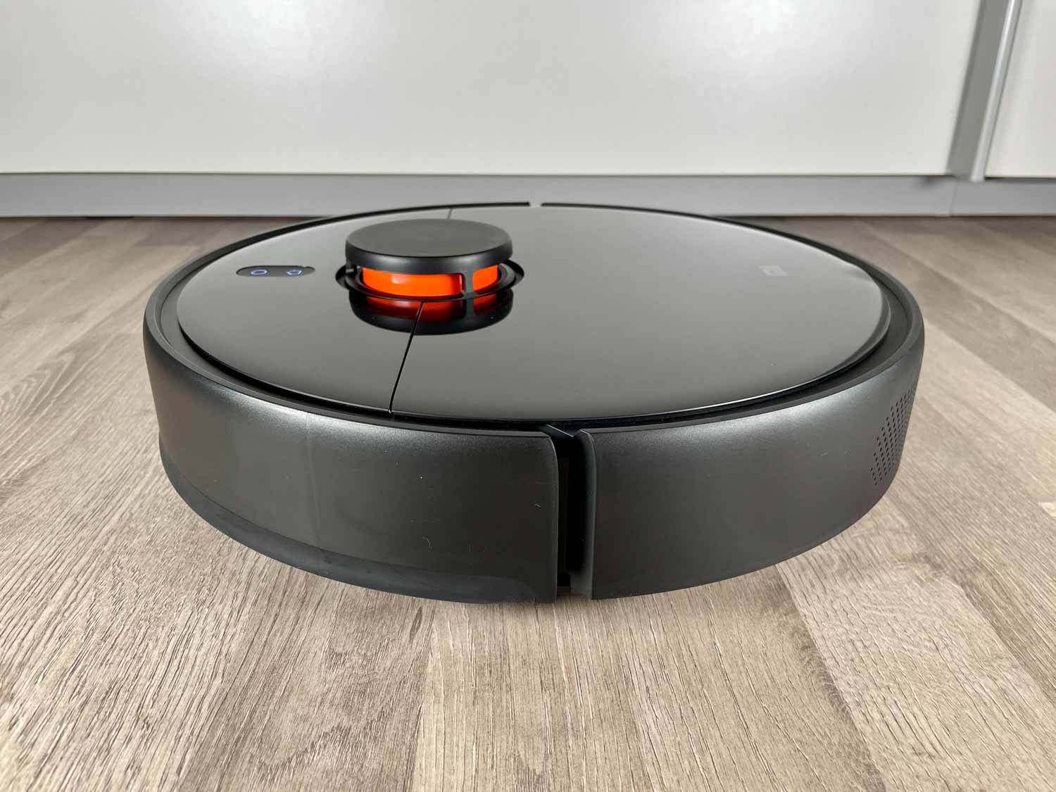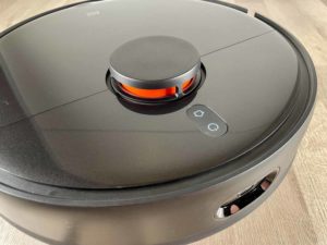 Wie beschrieben, schlicht und einfach passt er sich mit seinem Aussehen an jedes Zuhause an. Auf der Oberseite, die im Übrigen vollständig glänzend schwarz ist, gibt es nicht wirklich viel zu entdecken. Der LiDAR-Sensor wird wie üblich in Form eines Turmes verbaut und der Sensor selbst erstrahlt in einem auffälligen Orange. Vor dem Turm befinden sich zwei Steuerelemente, mit denen man den Roboter starten, stoppen oder zur Ladestation zurückschicken kann. Etwas weiter hinten befindet sich ein in grau aufgedrucktes Mi-Logo.