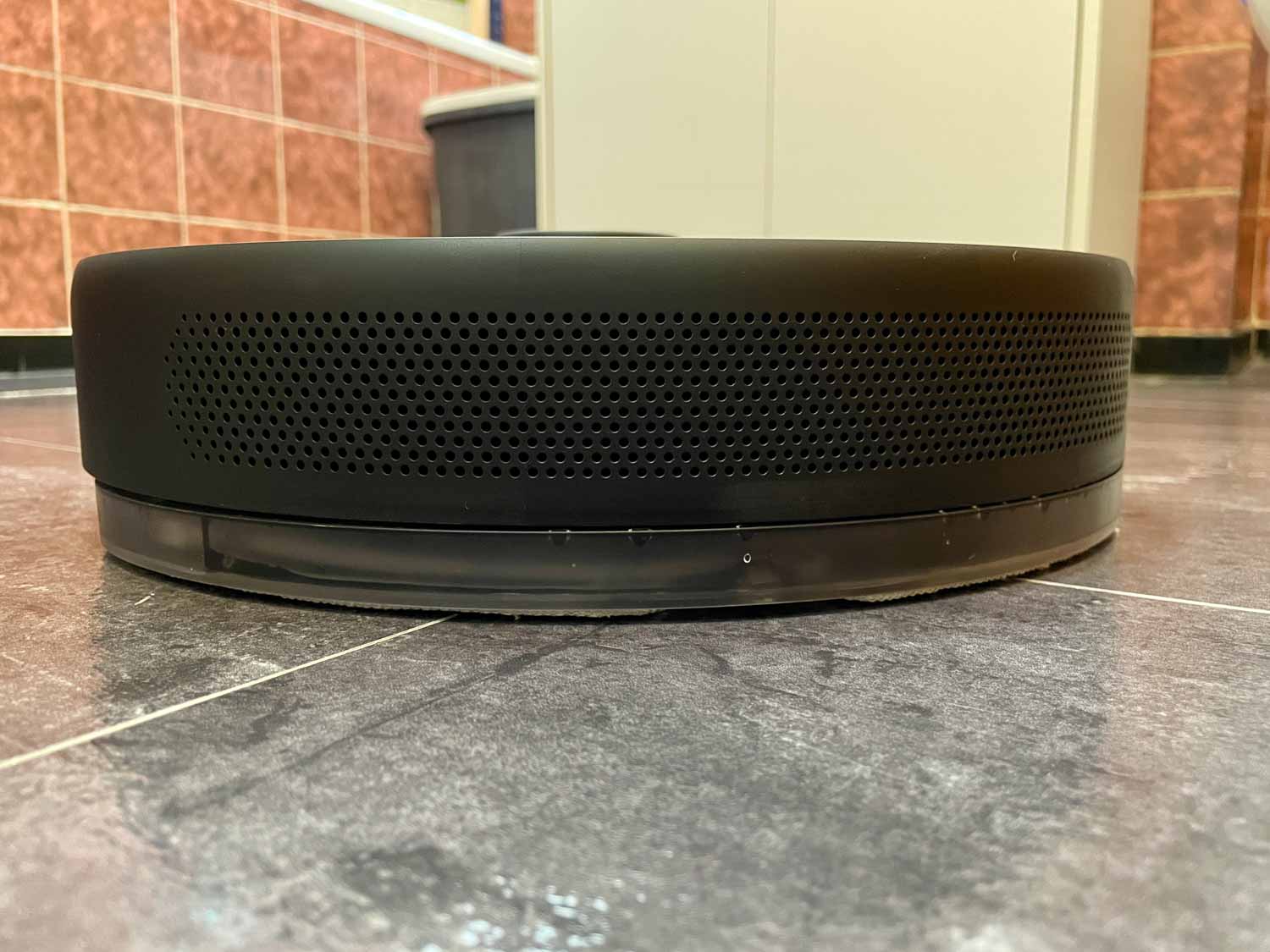 Auf der Front erkennt man sofort den obligatorischen Bumper und die Aussparung für den Obstacle Avoidance (3D-Hinderniserkennung). Seitlich gibt es lediglich einen Wandsensor zu sehen, der für die Abstandsmessung zur Wand da ist. Der Trend geht in den Verzicht dieses Sensors, was jedoch auf eine schlechtere Navigation zurückführt. Am Heck befindet sich lediglich ein sehr großes Abluftgitter, hinter dem sich auch ein Lautsprecher befindet.