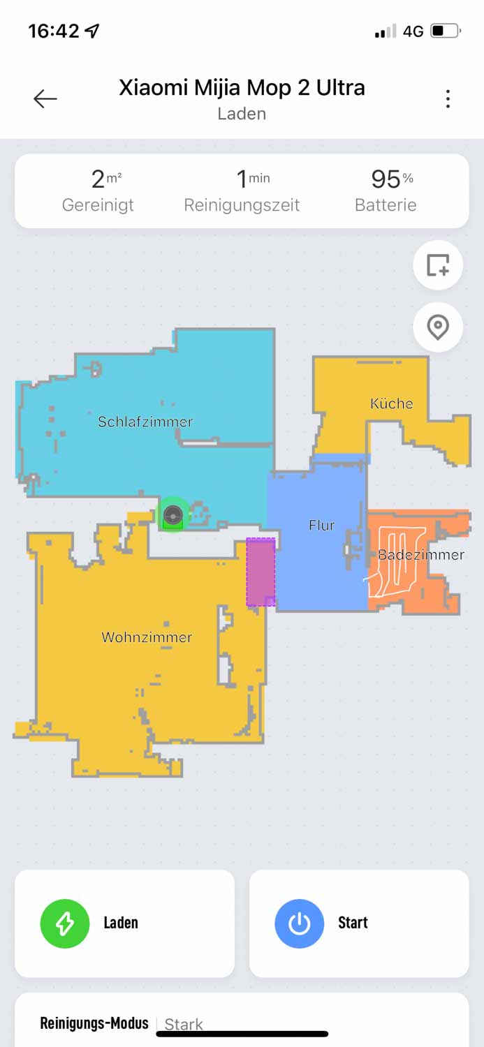 Der Xiaomi Mi Mop 2 Ultra zeigt im Test, dass er immer die Ladestation nach Beendigung der Reinigung wiederfindet. Dabei umfährt er im Weg liegende Hindernisse zielsicher und dockt in zehn von zehn versuchen zuverlässig auf Ladestation und Absaugstation an. Wenn er mal nicht richtig auf der Station sitzt, fährt er kurz zurück und probiert es erneut. Das kommt jedoch fast nie vor.