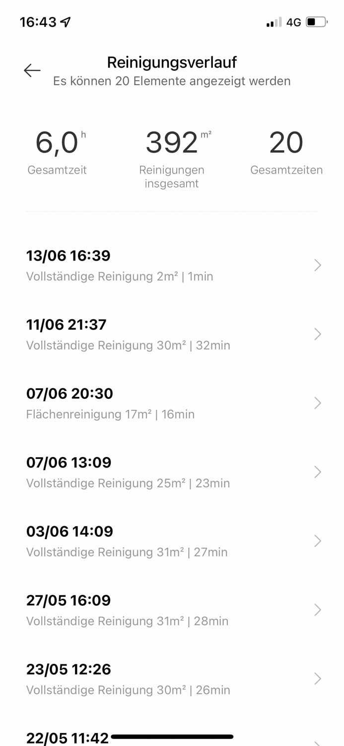 | Reinigungsverlauf | Die vergangenen Reinigungen können eingesehen werden. |