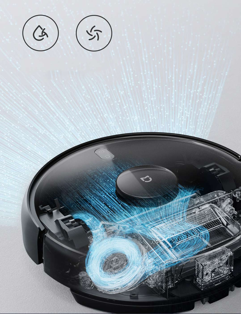 Xiaomi sorgt mit 4000 Pascal für eine ordentliche Saugleistung. In Kombination mit der Hauptbürste, die sowohl aus Borsten, wie auch aus Gummilamellen besteht, soll eine perfekte Harmonie geschaffen worden sein. Hausschmutz jeglicher Art wird aufgesaugt und in den beutellosen Staubbehälter transportiert. Auf Teppichboden wird automatisch die Leistung der Saugstufe auf ein Maximum gesetzt und beim Wischen wird Teppich instinktiv gemieden.