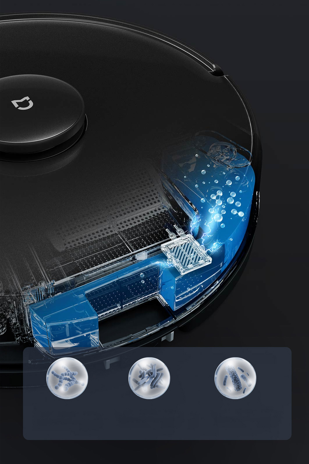 Ebenfalls neu ist die vibrierende Wischfunktion. Diese hat den Vorteil, dass sie hartnäckigere Verschmutzungen deutlich effizienter beseitigen kann. Ein schön gleichmäßiges Wischbild wird ebenfalls entstehen. So haben uns das die Roboter anderer Hersteller mit ähnlicher Wischfunktion schon vorgemacht. Durch einen elektrochemischen Vorgang im Inneren des Wassertanks wird das eingefüllte Wasser zudem desinfiziert. Das sorgt für 99 Prozent weniger Bakterien- und Keimbildung im Wassertank.