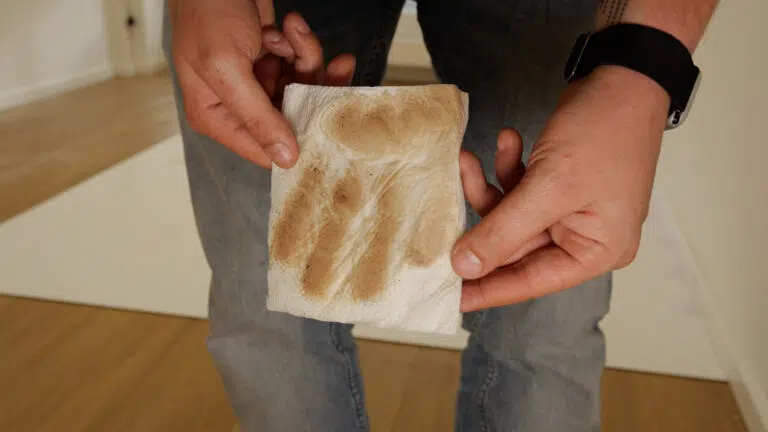Im Anschluss an den Wischtest überprüfen wir, wie sauber der Boden wirklich ist, und wischen mit einem feuchten Tuch nach. Da der Xiaomi 5 Pro die Flecken nicht gänzlich entfernen konnte, bleiben auch auf dem Tuch noch deutliche Rückstände zurück. Letztendlich ist die Wischleistung auf der Fläche eher unterdurchschnittlich, was auch an der fehlerhaften KI-Schmutzerkennung liegt.