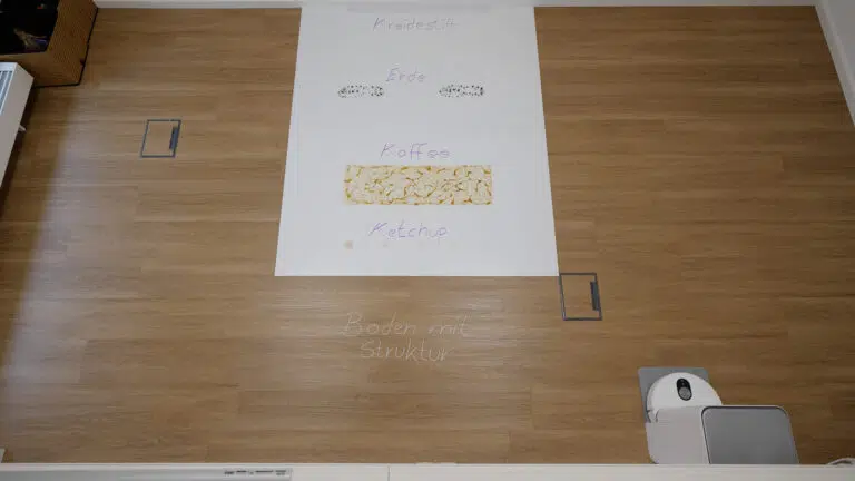 Nach dem Test der Saugleistungen blicken wir nun auf die Wischfähigkeiten des Xiaomi Robot Vacuum 5 Pro. Dazu unterziehen wir den Saugroboter einem echten Härtetest. Auf dem Boden sind angetrocknete Matschschuhabdrücke, Kaffee- und Ketchupflecken und Schrift mit Kreidestift zu sehen, die der Roboter entfernen soll. Dabei ist der Automatikmodus aktiviert, damit das Gerät bestenfalls seine KI-Erkennung nutzen kann. Zudem hat der Xiaomi 5 Pro jederzeit Zugang zu seiner Basisstation.