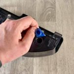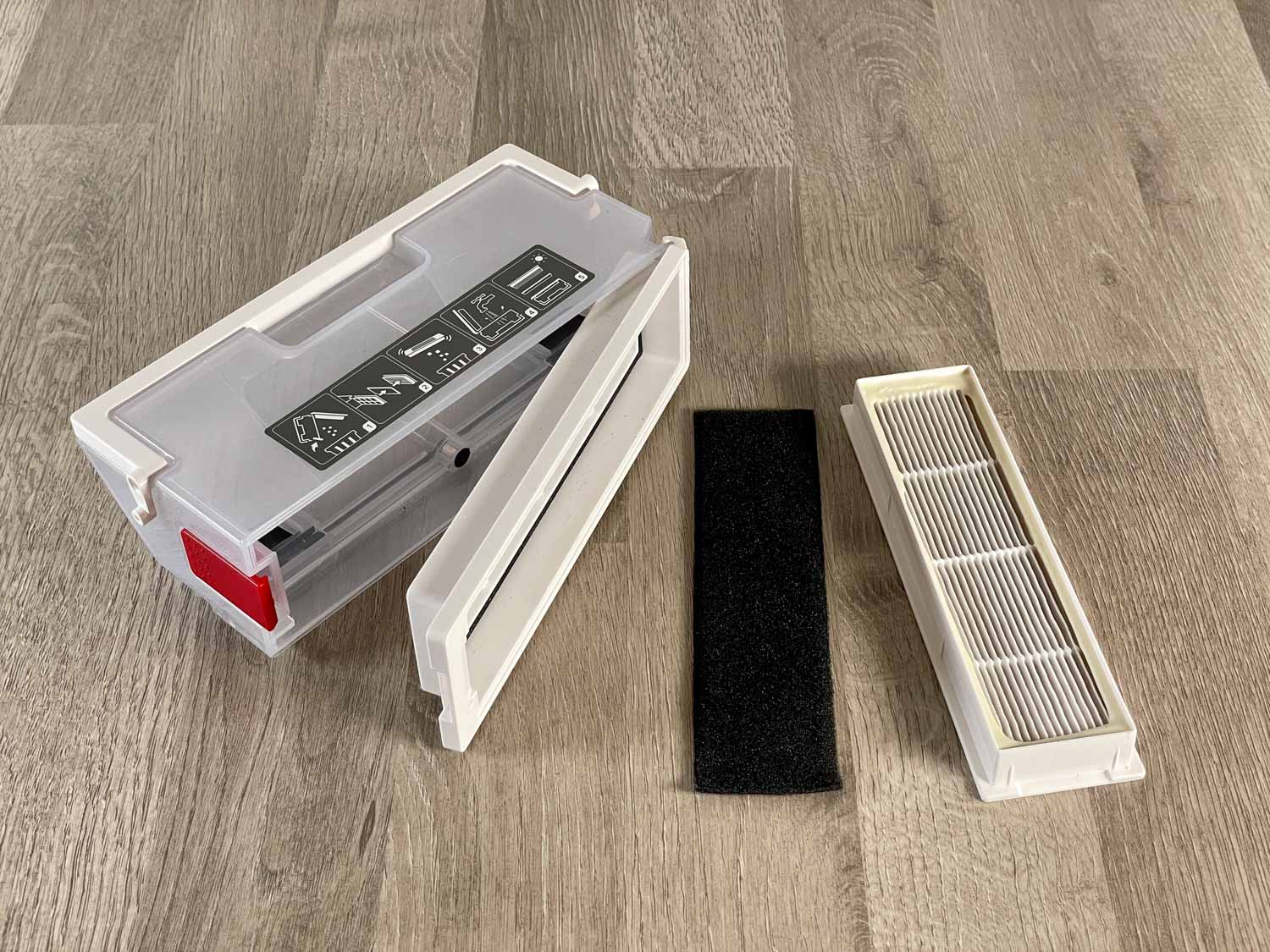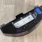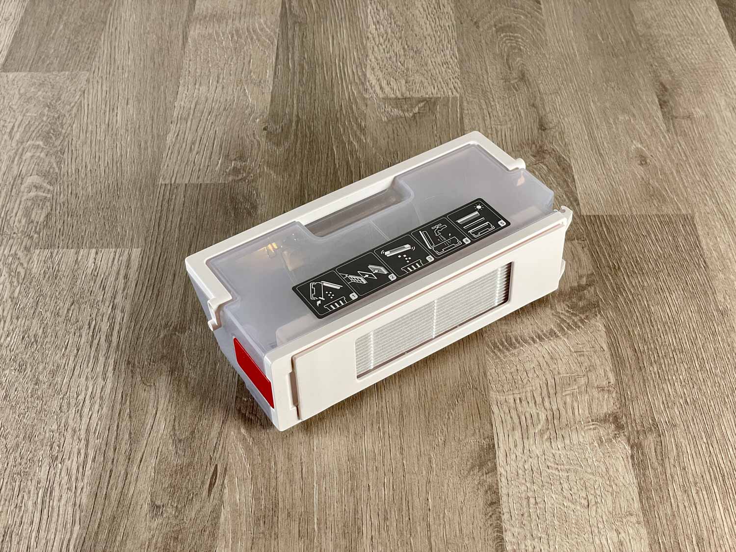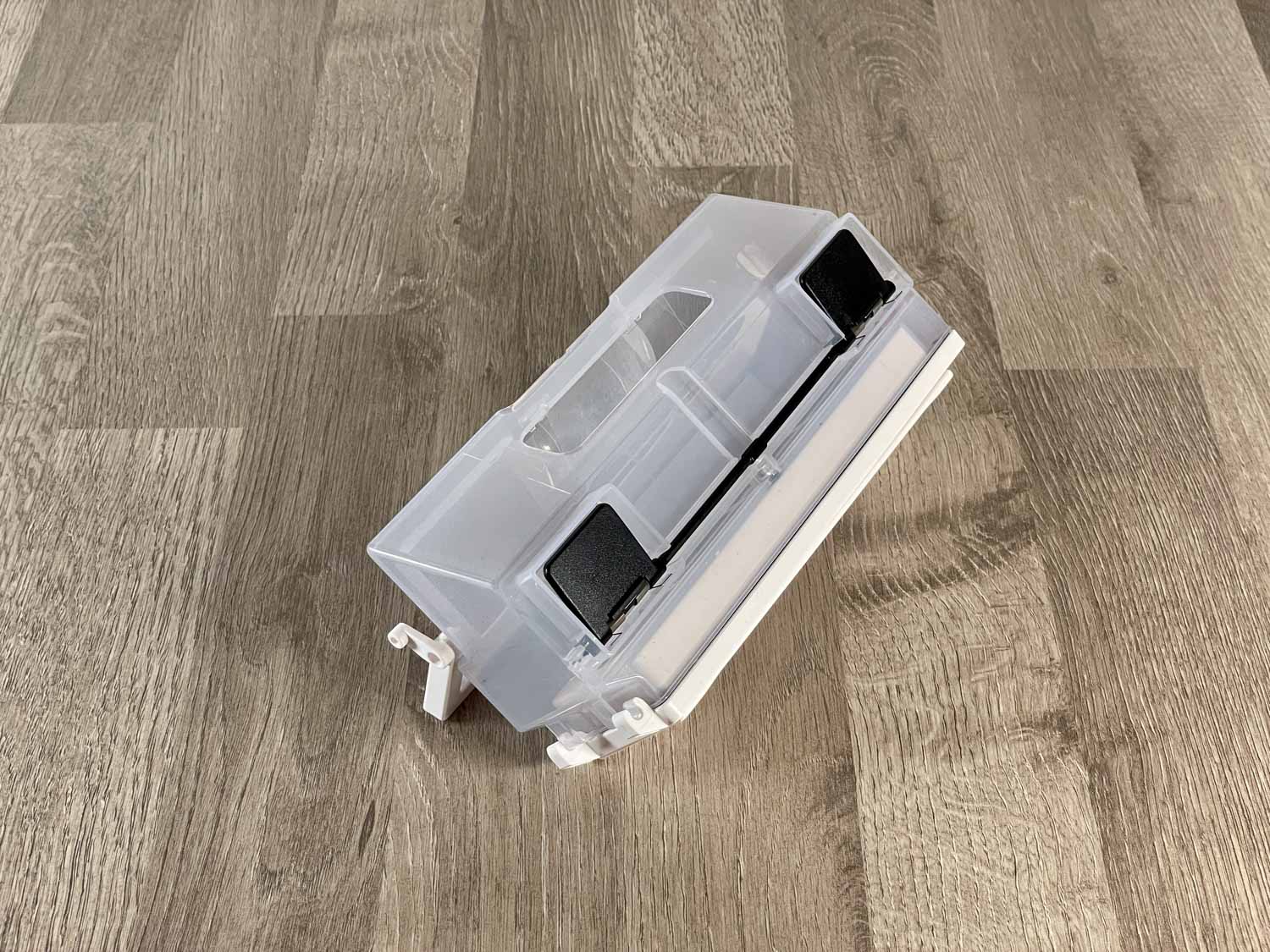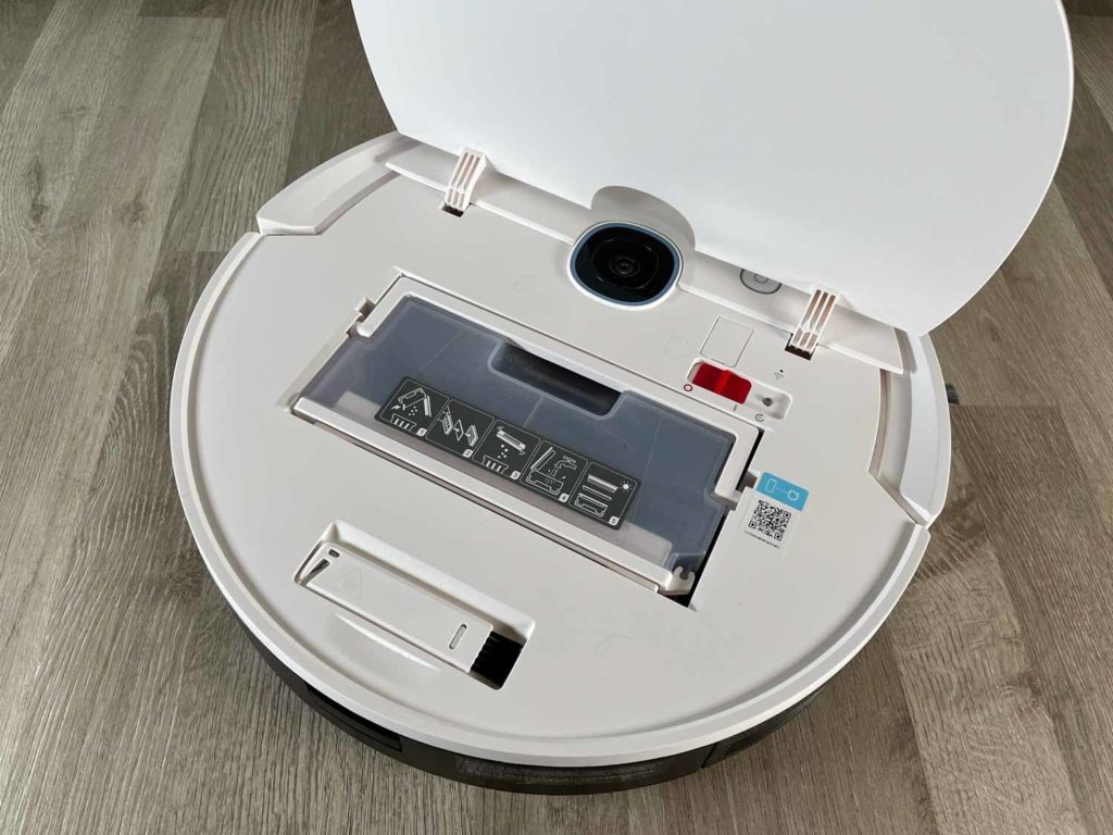 Auch der Staubbehälter entpuppt sich als derselbe, den die modernen ECOVACS Saug- und Wischroboter mit Absaugstation haben. Er ist milchig, transparent und besitzt einen Henkel zum Herausheben. Er ist mit einem 3-Filter-System bestückt, was vorrangig für Allergiker interessant ist. Auf der Unterseite befinden sich gefederte Kunststoffklappen, die bei einer Absaugung auf der Absaugstation geöffnet werden, um den Staubbehälter auszusaugen. Aufzuklappen und auszuleeren ist der Staubbehälter komfortabel über einen roten Knopf auf der Seite.