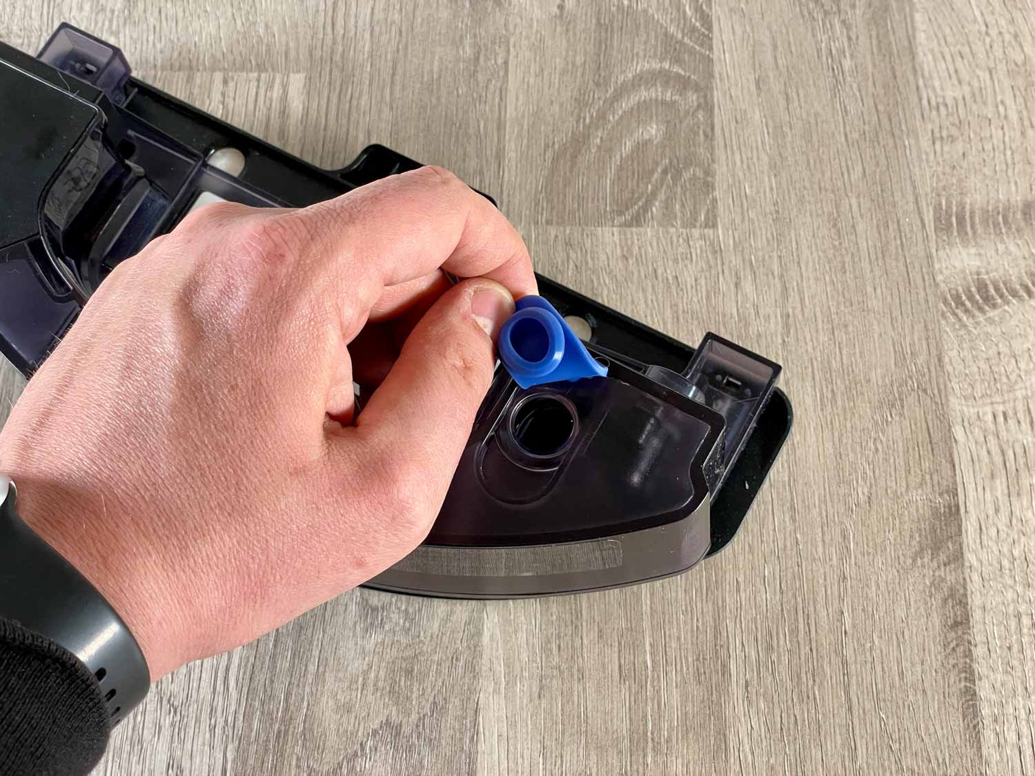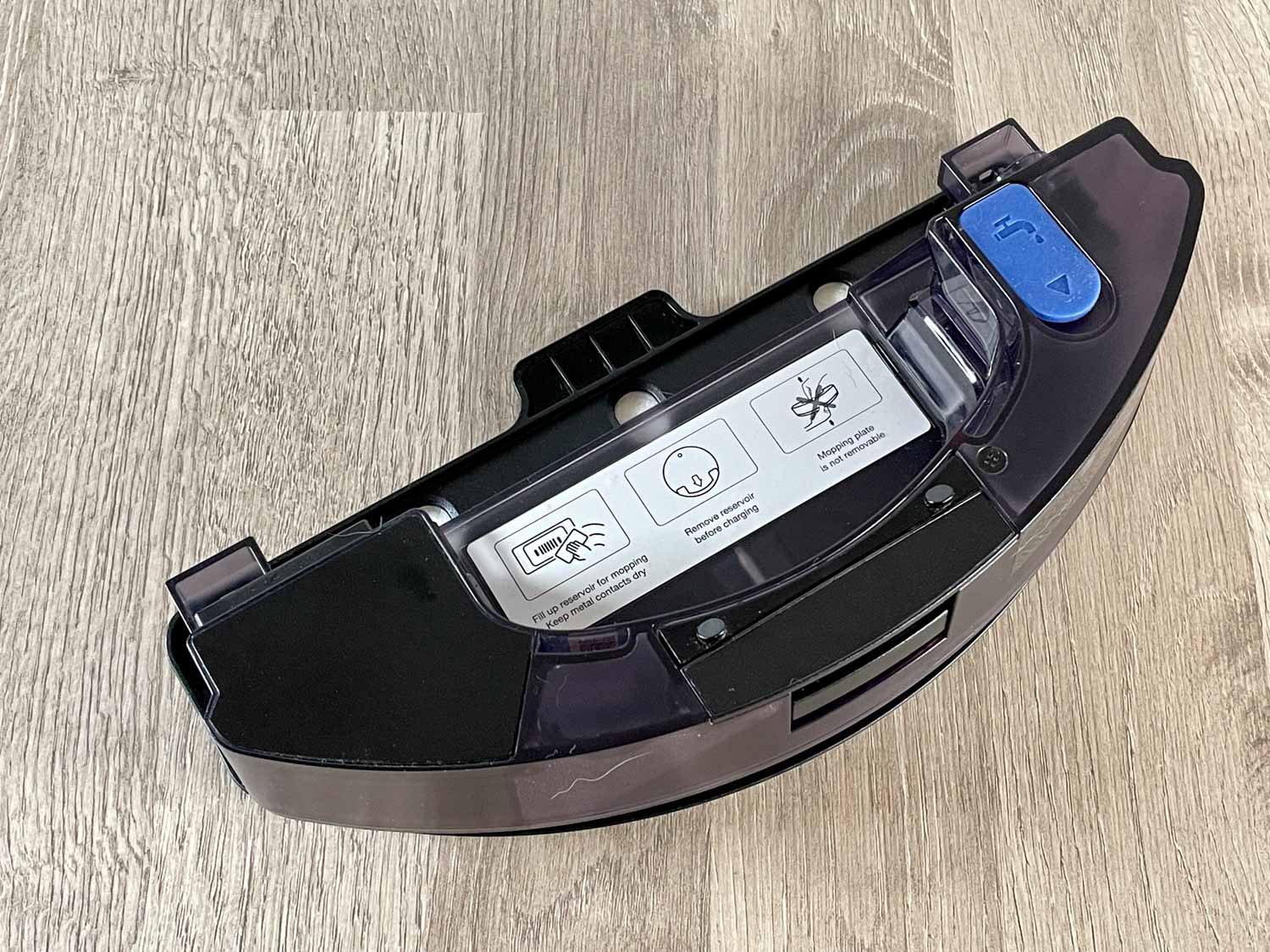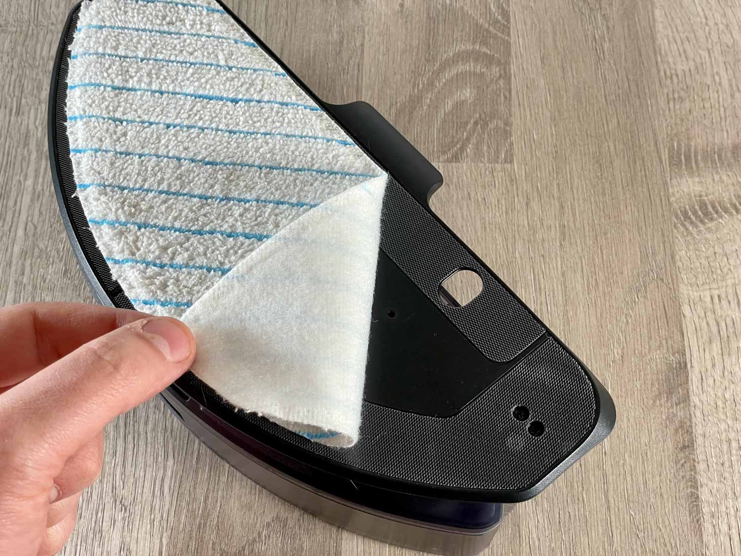 Auch das oszillierende Wisch-Modul entpuppt sich als dasselbe, das schon im ECOVACS T8 zum Einsatz kam. Hierbei handelt es sich um die erste Generation der oszillierenden OZMO PRO Wischfunktion. Das Modul ist Wischplatte und Wassertank in einem. Über einen blauen Gummiverschluss füllt man das Wasser ein. Das montierte Wischtuch soll laut yeedi ein wiederverwendbares Wischtuch darstellen. Es ist jedoch ein Einwegwischtuch, wie es ECOVACS bei seinen Geräten betitelt. Es verfügt über eine Mikrofaser-Oberfläche, was die Reinigung effizienter machen soll. Da wird man um einen Nachkauf nicht drum herumkommen, da es keine weiteren Wischtücher im Lieferumfang gibt. Das beigelegte Wisch-Modul wird über den Roboter mit Strom versorgt und lässt sich nicht mit dessen Vorgängern kombinieren.