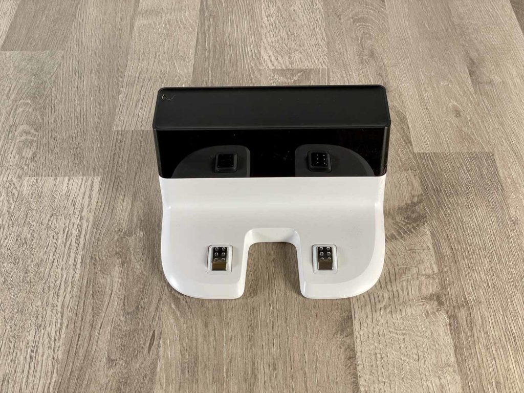 Die Absaugstation des Yeedi Vac Station muss nach dem Auspacken zusammengebaut werden und ist exakt dieselbe, die ECOVACS für ihre Geräte anbietet und verkauft. Bis auf blaue Farbelemente und eine Kleinigkeit, die vorne an der Station angebracht werden kann. Dabei handelt es sich um eine transparente Vorplatte, die es erlaubt, dem Roboter den Zugang zur Absaugstation zu erleichtern. Auch ein kleiner Teil des Wischlappens wird nach der Reinigung darauf geparkt und nicht auf dem Boden. Der Staubbehälter wird, durch diese Station, immer restlos aussaugt. Wenn er jedoch zu voll sein sollte, kann es schon mal vorkommen, dass es die Station nicht schafft. Dann muss händisch eingegriffen werden. Bei einer täglichen Reinigung fällt aber nie so viel Schmutz an.
