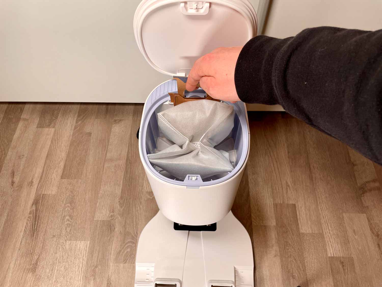 Die Absaugstation kann nur mit Beuteln benutzt werden. Eine beutellose Variante ist nicht verfügbar. Der Gebläseauslass der Station befindet sich über dem Roboter, was ihn bei jeder Entleerung von Staub und Schmutz befreit.