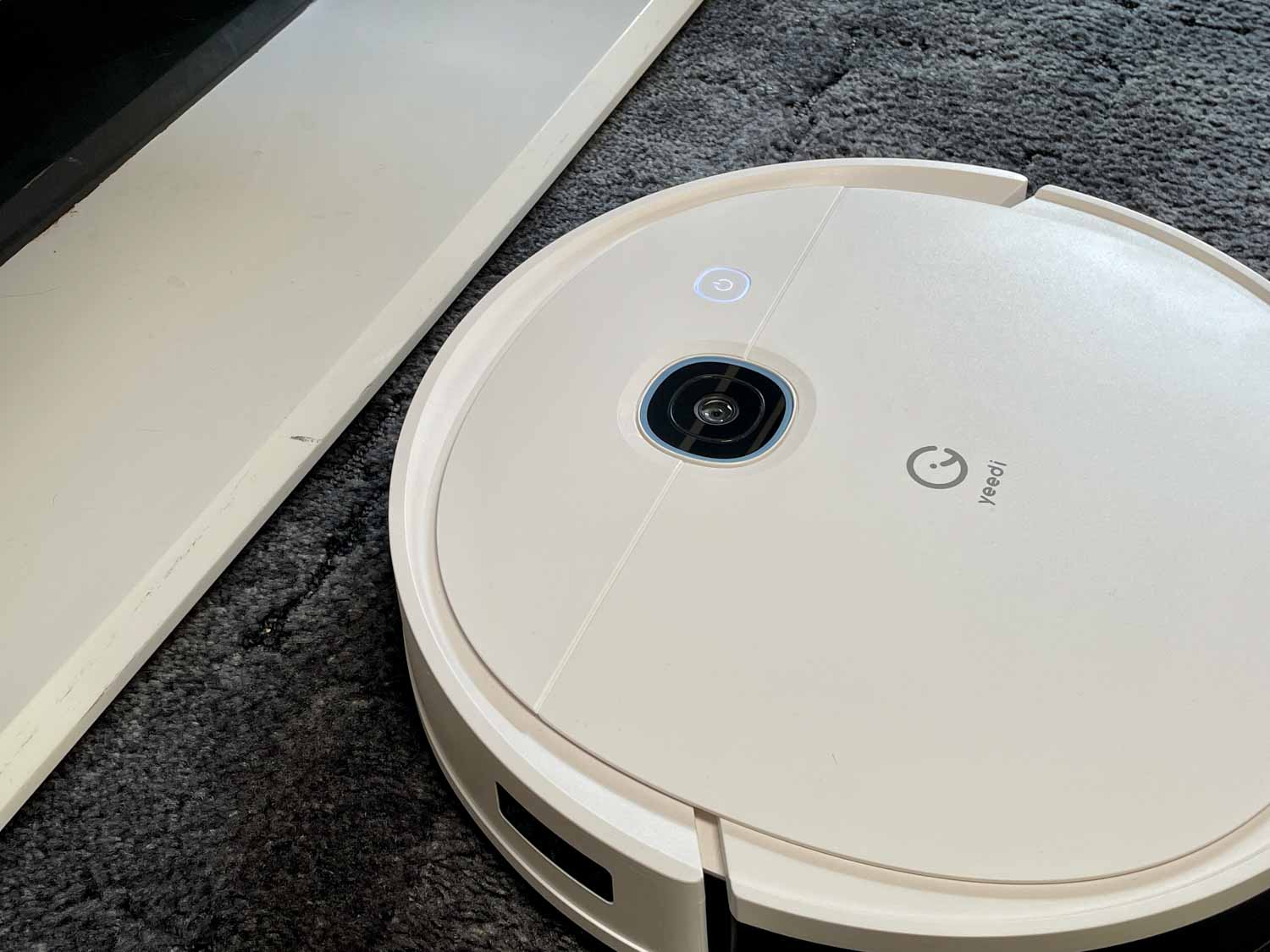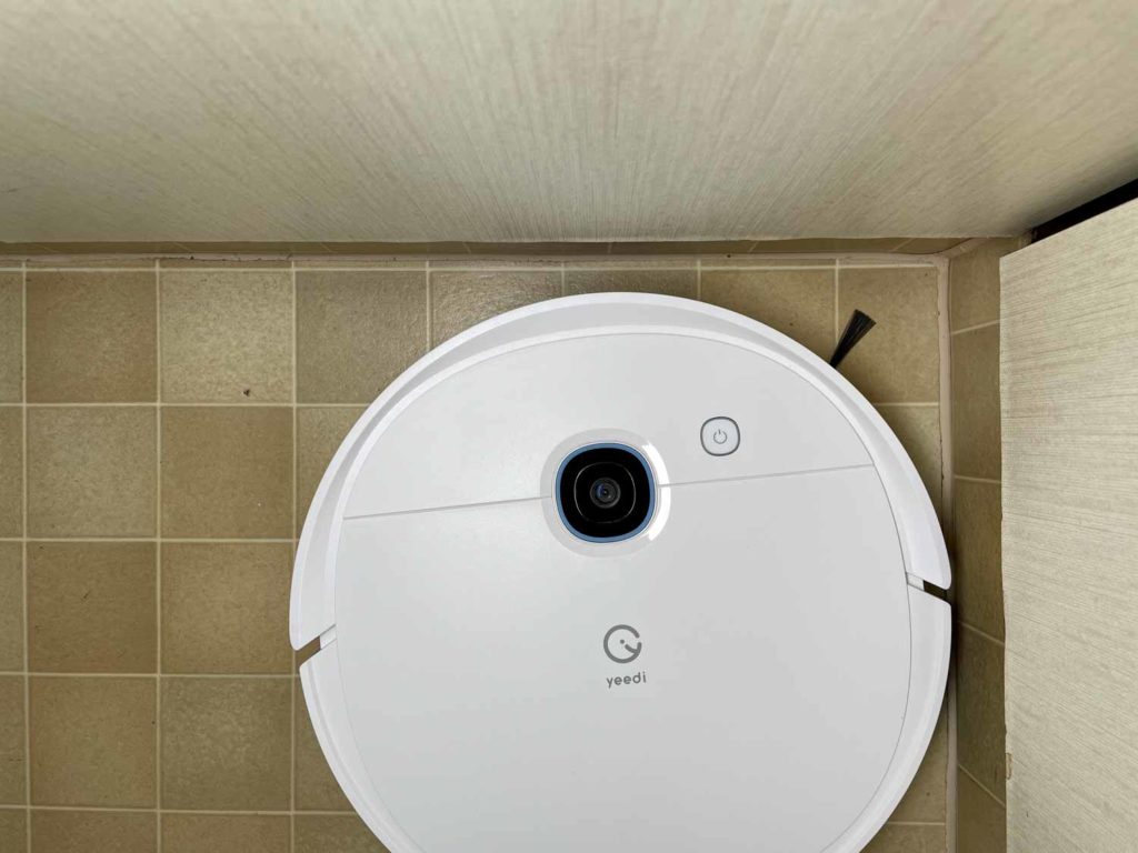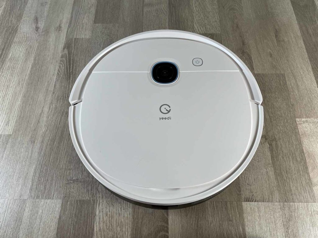 Auf der matt weißen Oberseite hat sich zu seinem Vorgänger nichts geändert. Vor dem aufgedruckten yeedi Logo befindet sich die Kamera. Diese ist an die Decke gerichtet und kann keine Fotos schießen. Diese dient rein zur Orientierung. Ein einziger, leuchtender Knopf ist wieder verbaut, mit dem man den Roboter starten, stoppen und zur Ladestation oder Absaugstation zurückschicken kann.