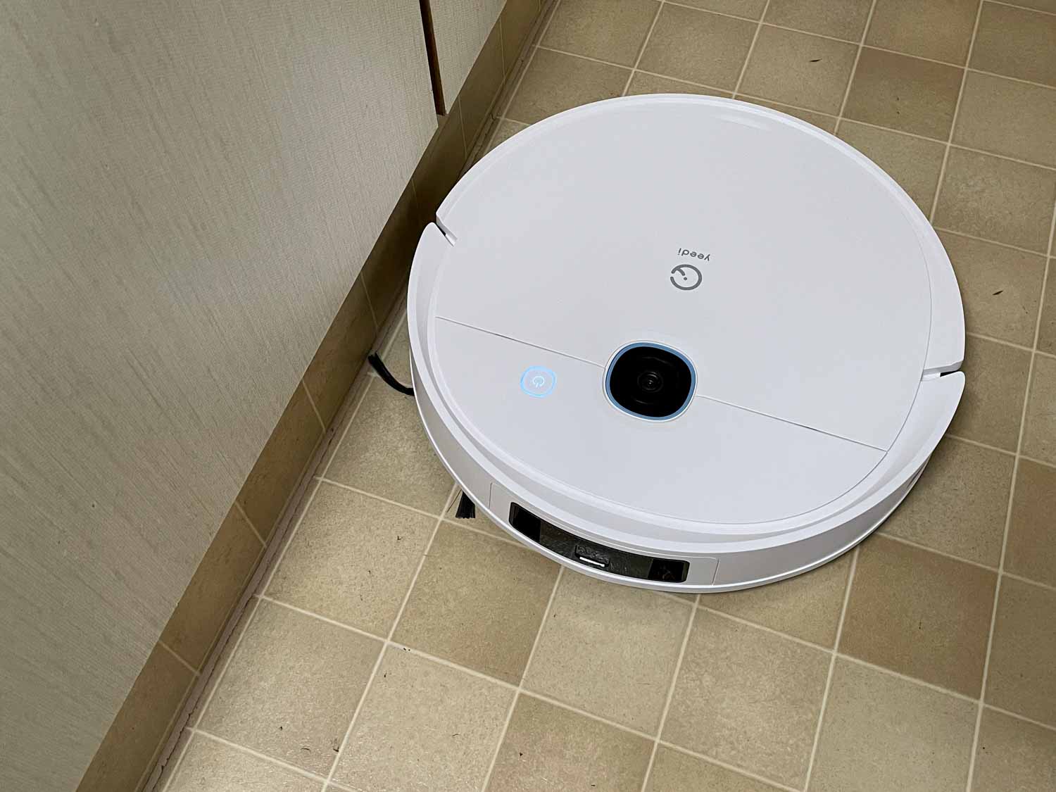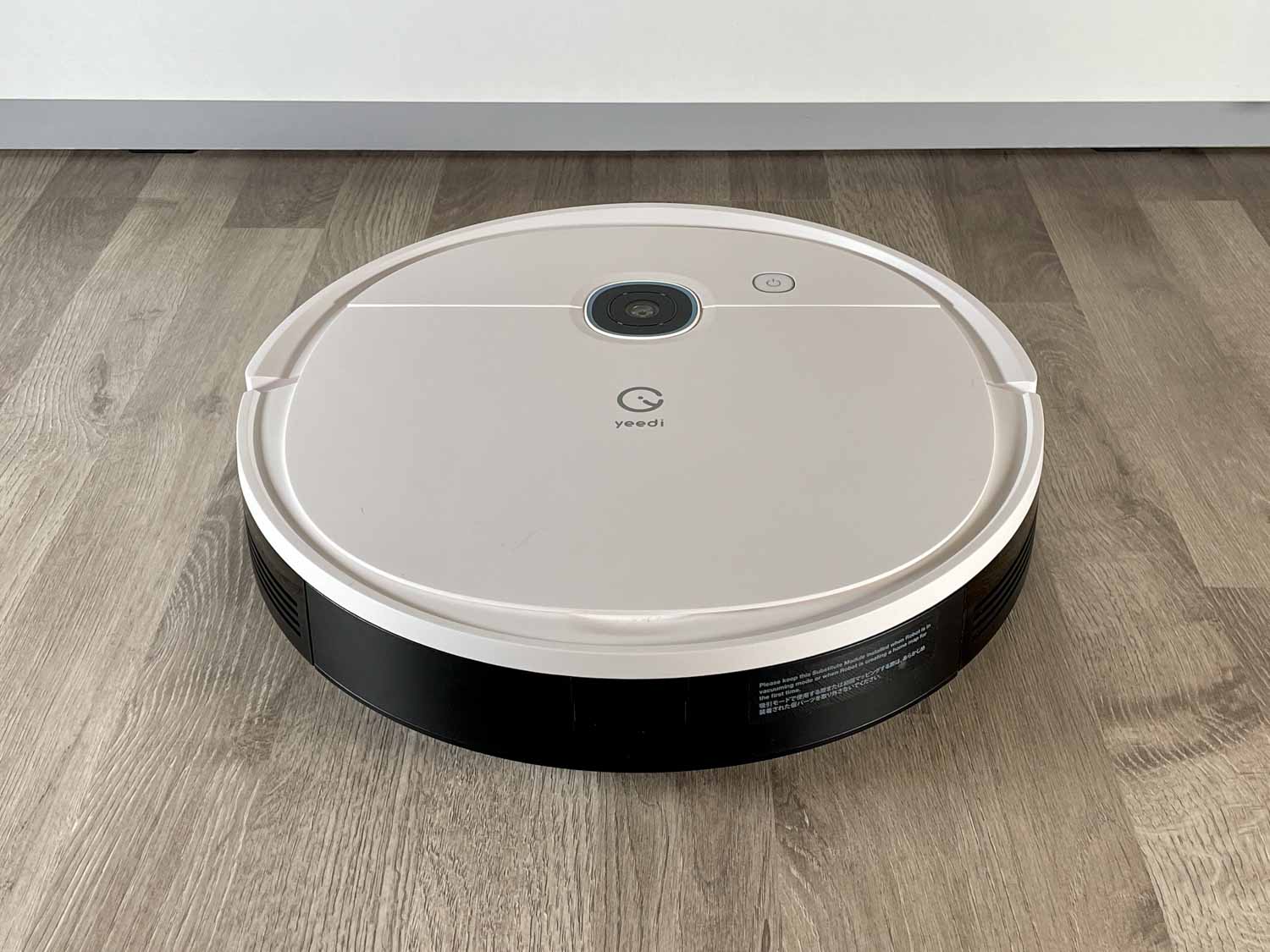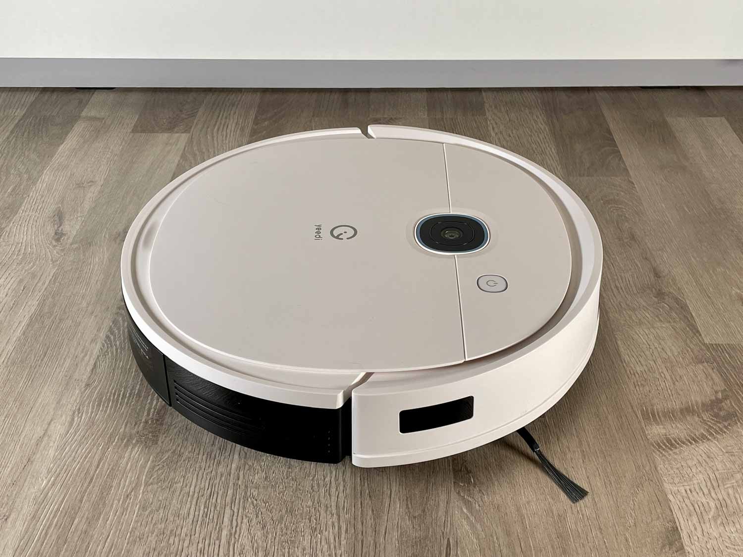 Auf der matt weißen Oberseite hat sich zu seinem Vorgänger nichts geändert. Vor dem aufgedruckten yeedi Logo befindet sich die Kamera. Diese ist an die Decke gerichtet und kann keine Fotos schießen. Diese dient rein zur Orientierung. Ein einziger, leuchtender Knopf ist wieder verbaut, mit dem man den Roboter starten, stoppen und zur Ladestation oder Absaugstation zurückschicken kann.