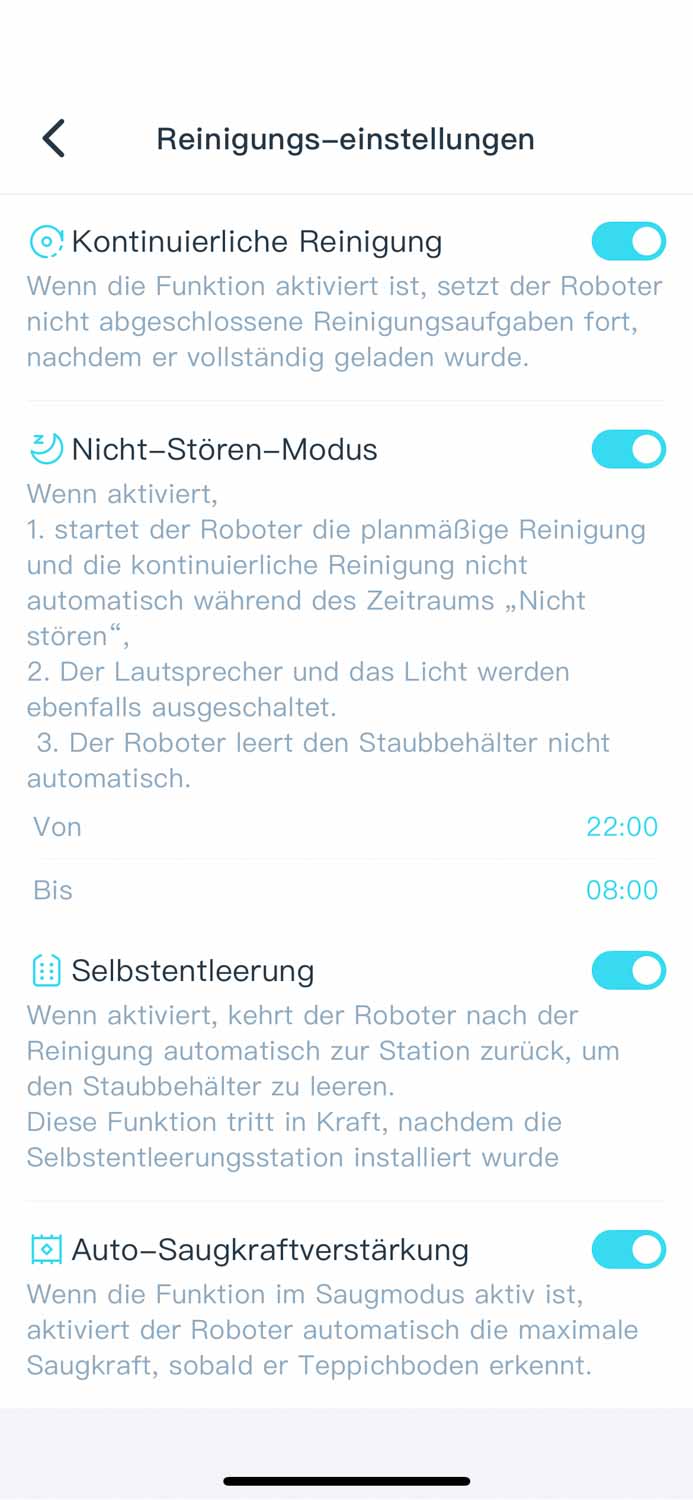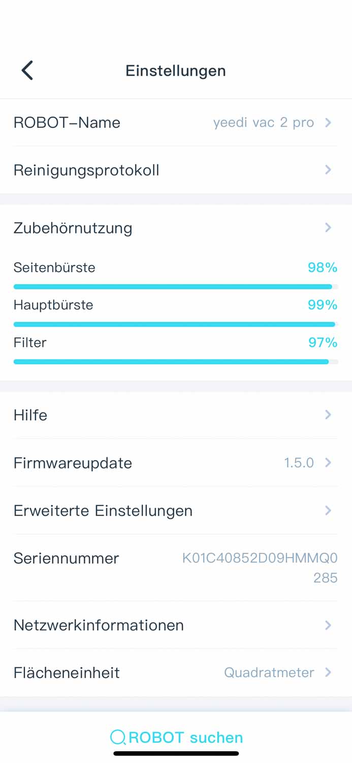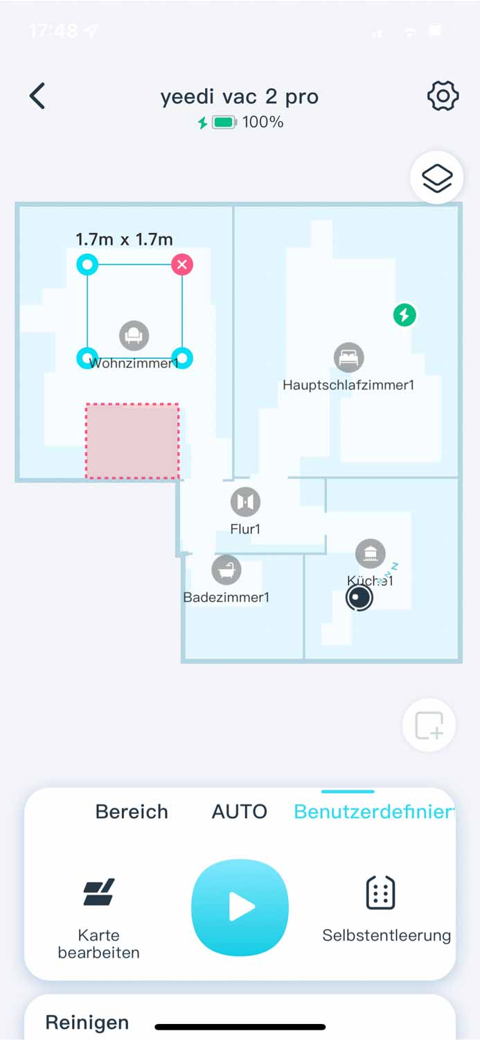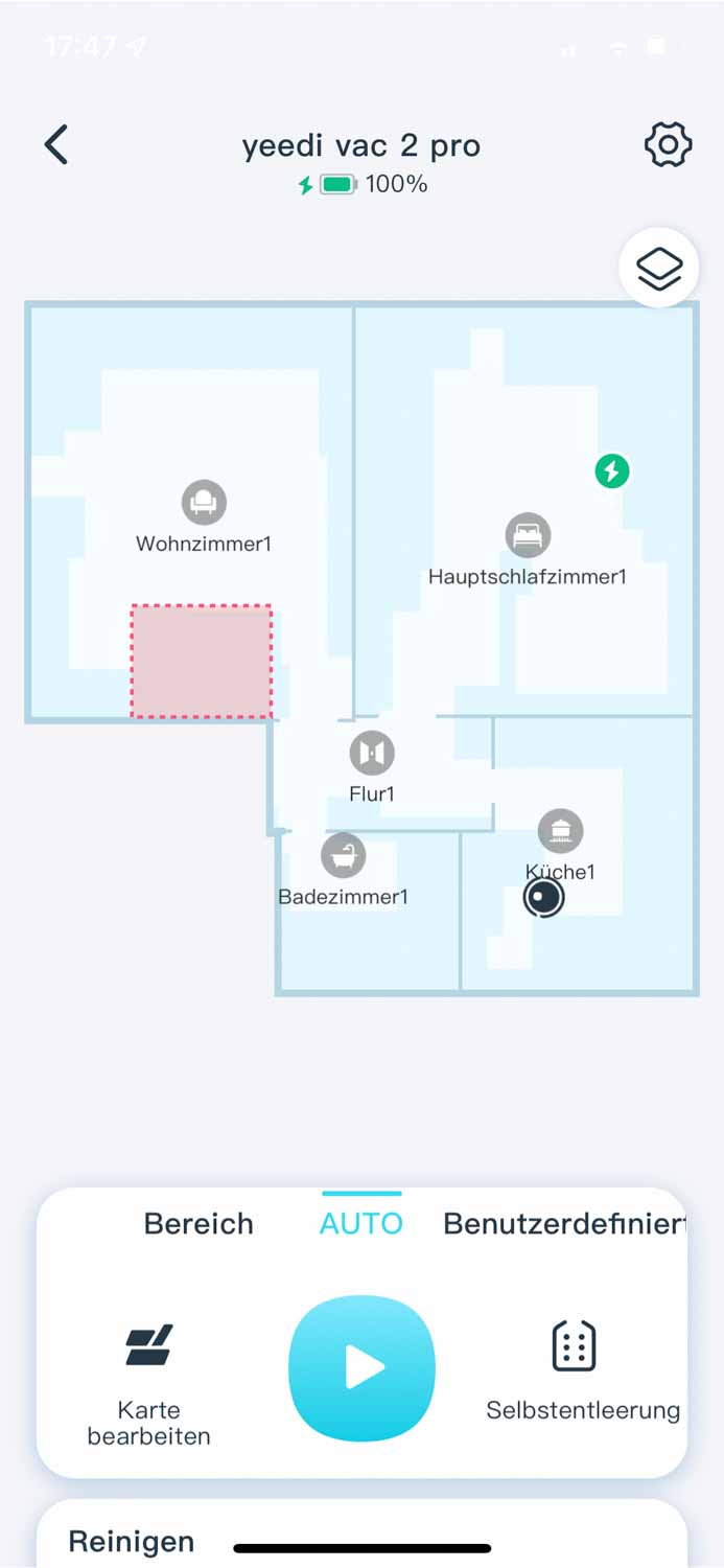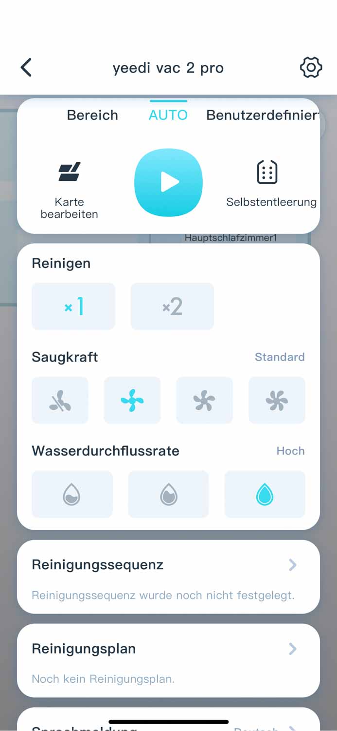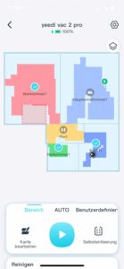 In der App sind mir persönlich zu wenige Einstellmöglichkeiten vorhanden. Das Anpassen der Absaugstation wäre nett gewesen, jedoch nicht unbedingt notwendig. Leder lässt sich kein Sauggang leistungstechnisch an jeden einzelnen Raum anpassen, sondern entweder alles oder nichts. Das manuelle Bearbeiten der Raumaufteilung ist nicht möglich und so kann es vorkommen, dass der yeedi vac 2 pro falsche Räume in die Karte einzeichnet, was nicht mehr rückgängig gemacht werden kann.