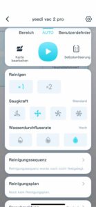 Der Yeedi Vac Station ist in der Lage, verschiedene Saugmodi einzusetzen. Dabei kann man auswählen, zwischen einer vollständigen Reinigung des kompletten Haushaltes, einer Einzelraumreinigung oder das Reinigen einer selbst erstellten Zone. Dabei kann man auswählen, ober er nur einmal oder gleich zweimal reinigt. Jedoch kann man nicht auswählen, dass er nur einzelne Räume einmal und die anderen zweimal saugt. Entweder alles oder gar nichts. Auszuwählen sind übrigens drei verschiedene Saugstärken.