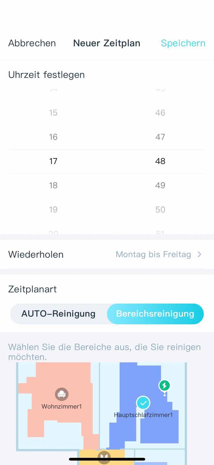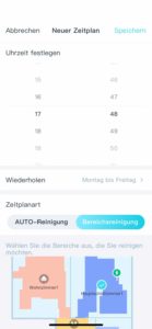 Durch einen einstellbaren Zeitplan ist der Yeedi in der Lage, selbständig zu einer bestimmten Uhrzeit für eine Reinigung loszufahren. Dabei kann man sogar einstellen, ob alles oder nur einzelne Räume gesaugt werden sollen. Auch an welchen Tagen er saugen soll, kann voreingestellt werden.
