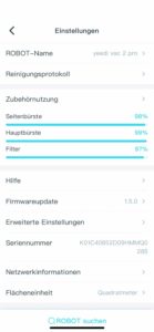 In der App gibt es eine kleine Ansicht der Verschleißteile, die irgendwann mal gewechselt werden müssen. Dabei zeigt ein kleiner Ladebalken den verbliebenen Zustand an. Man kann die Einzelteile für kleines Geld überall im Netz nachkaufen.