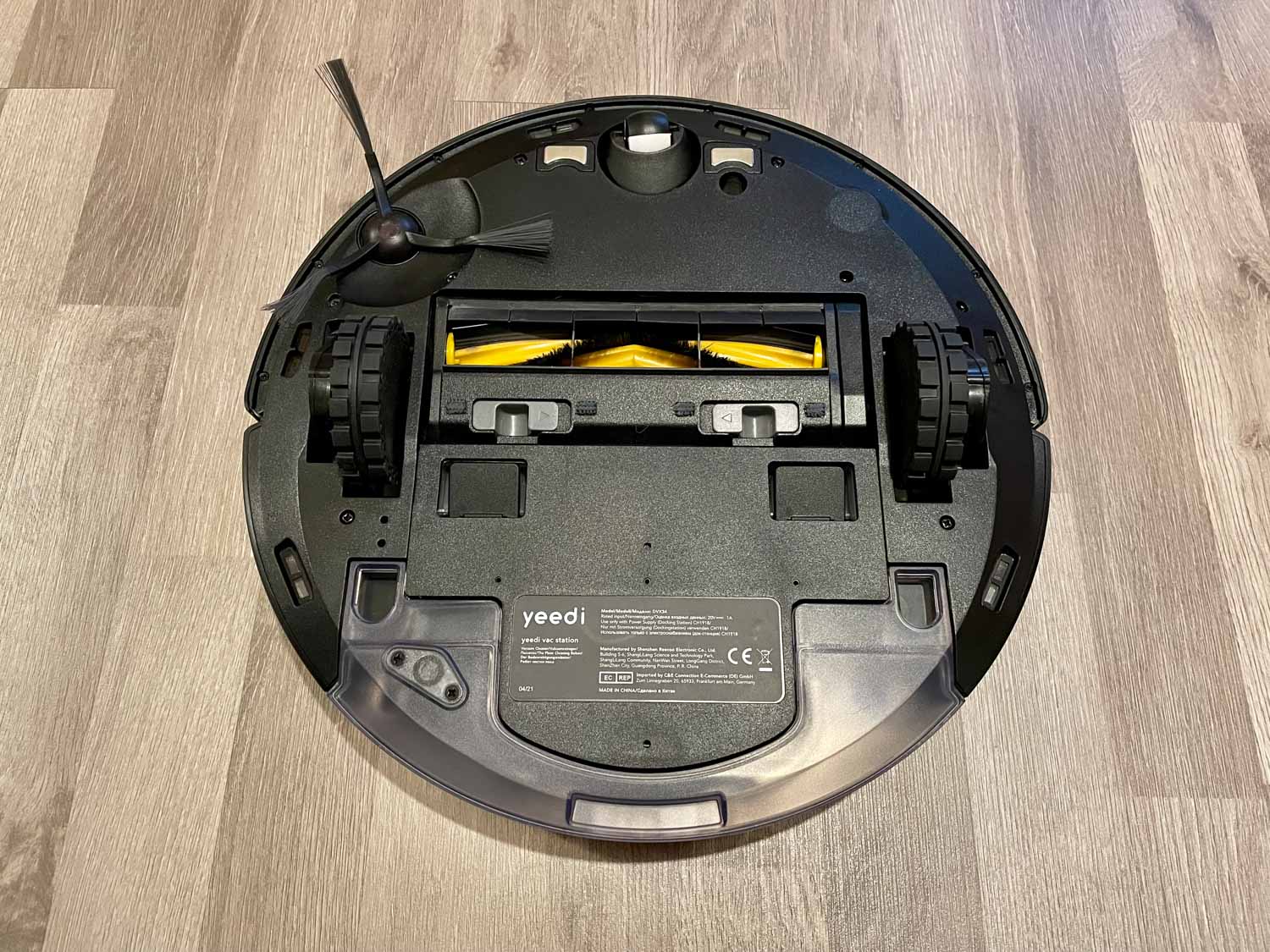 Kommt euch was bekannt vor? Ja! Der yeedi vac station sieht von unten aus wie ein Saug- und Wischroboter von ECOVACS. Letztlich ist er das auch. Er besitzt nur eine Seitenbürste, die vorn neben den metallen glänzenden Ladekontakte sitzt. Der Roboter besitzt ganze sechs Absturzsensoren und einen Ultraschallsensor, der Teppichboden erkennt. Die Kombibürste ist dieselbe, die auch die Geräte von ECOVACS bekommen. Diese lässt sich praktischerweise herausnehmen und für die Reinigung sogar komplett auseinander bauen.
