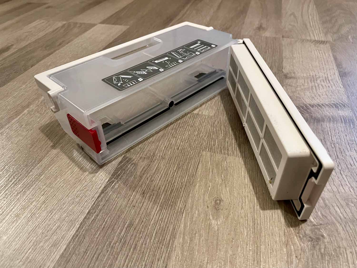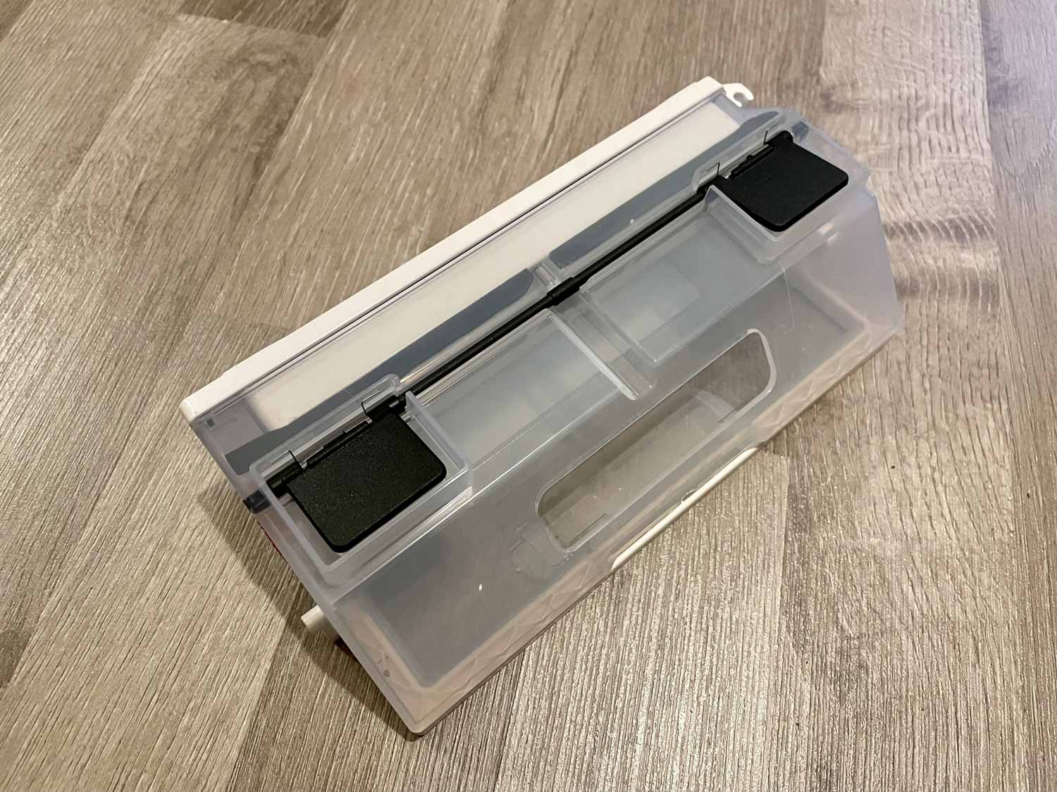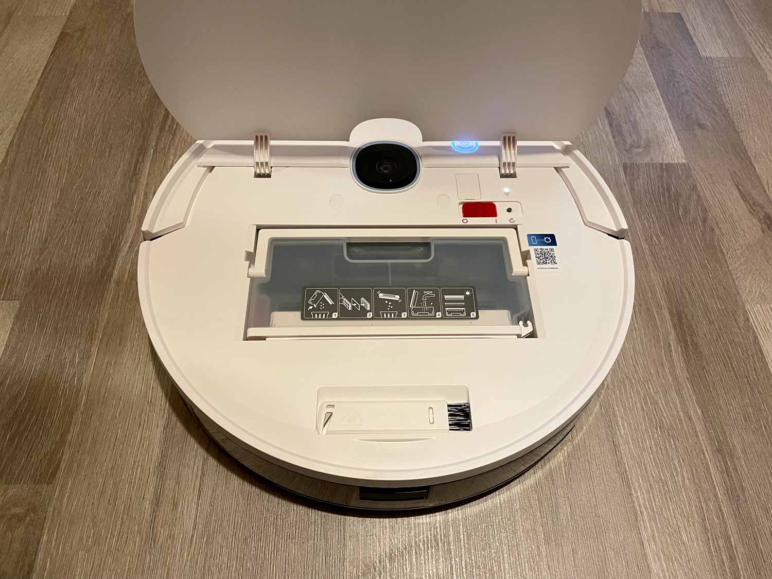 Auch der Staubbehälter entpuppt sich als derselbe, den die modernen ECOVACS Saug- und Wischroboter mit Absaugstation haben. Er ist milchig, transparent und besitzt einen Henkel zum Herausheben. Er ist mit einem 3-Filter-System bestückt, das hocheffektiv arbeitet. Auf der Unterseite befinden sich gefederte Kunststoffklappen, die bei einer Absaugung auf der Station geöffnet werden, um den Staubbehälter auszusaugen. Aufzuklappen und auszuleeren ist der Staubbehälter komfortabel über einen roten Knopf auf der Seite.
