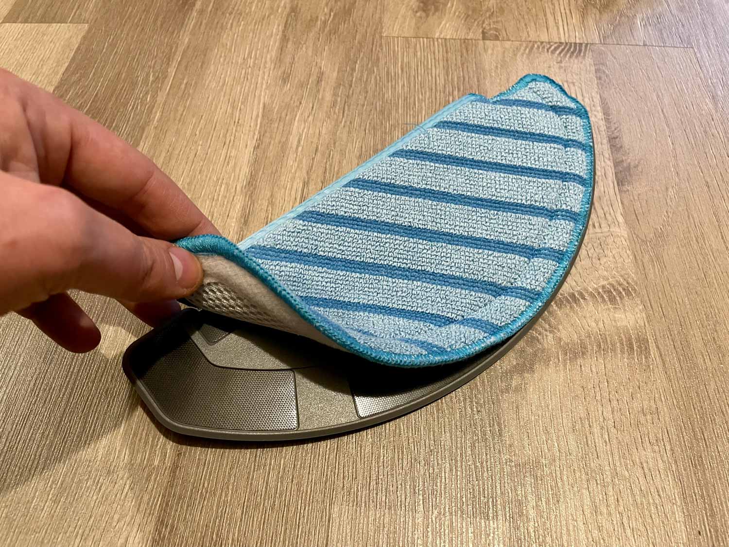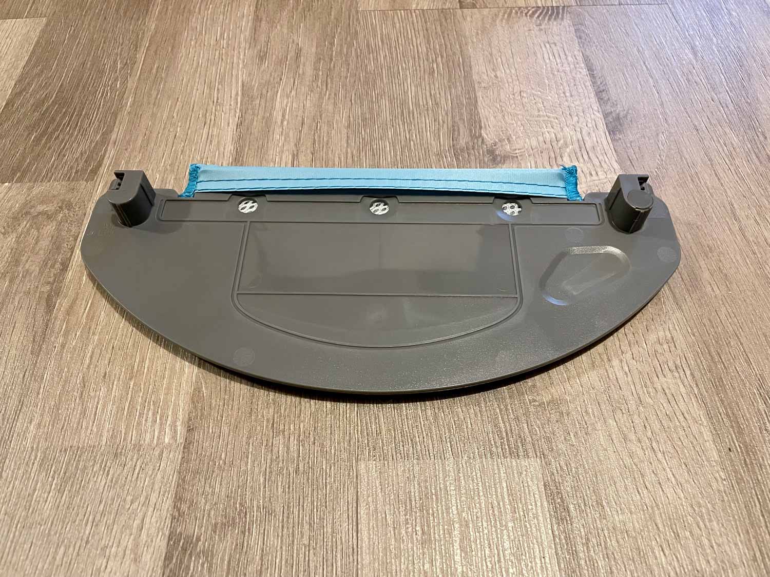 Exakt wieder die gleiche Wischplatte, wie vom großen Bruder verkauft wird. Sie ist grau, lässt sich unter den Wassertank befestigen und hebt durch Klett das Wischtuch. Dieses ist schön dick und verteilt besser Wasser, als es dünne Wischtücher machen. Auch die Einwegwischtücher lassen sich ohne viel Zutun befestigen. Die Wischplatte selbst ist mit etwas Gefummel vom Wassertank wieder abzuziehen. Der Roboter schaltet automatisch in den Wischvorgang, wenn er die angebrachte Wischplatte erkennt.