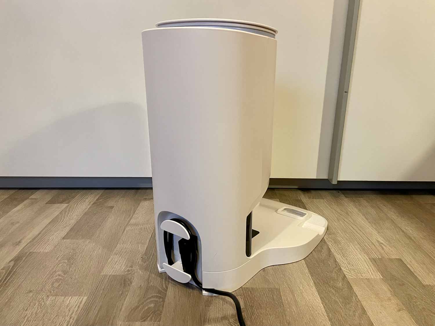 Die Absaugstation hat auf der Rückseite eine praktische Kabelaufwicklung, die unnötigen Kabelsalat den Kampf ansagt. Auf seiner Auffahrplatte befinden sich zwei Löcher, durch die der Schmutz aus dem Roboter abgesaugt wird. Der Deckel der Absaugstation lässt sich durch einen Druck öffnen und darin befindet sich dann der eingesetzte Staubbeutel, der für mehrere Wochen den Schmutz einfängt. Der Beutel fungiert dabei auch als zusätzlicher Filter. Auf der Unterseite findet man einen transparenten Kanal, der zu öffnen ist, falls er verstopft sein sollte.