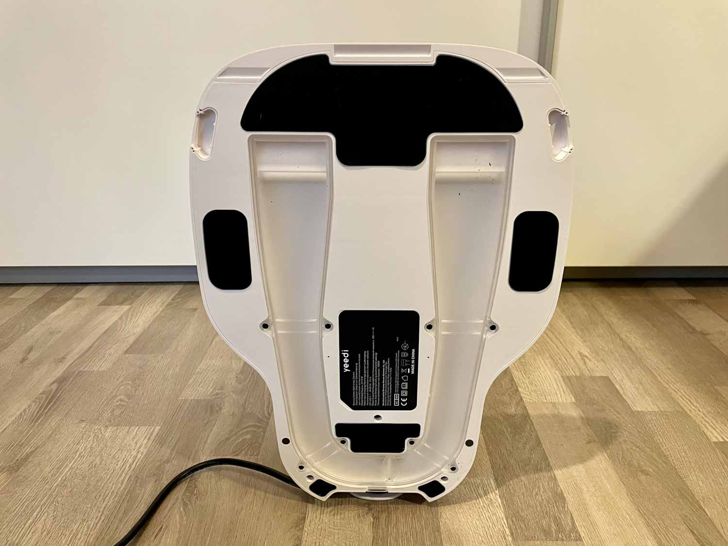 Hier bekommt der yeedi die Ozmo-Technologie verpasst, die auch im ECOVACS Deebot N8, N8Pro oder Ozmo 950 verbaut ist. Das ist letztlich nichts anderes, als das Hinterherziehen eines feuchten Lappens durch die ganze Wohnung. Der Lappen wird kontinuierlich, nach eingestellter Wasserzufuhr, mit Wasser benetzt und überträgt das auf den Boden. Das Wischbild ist im Test, wenn das Wischtuch vorher mit Wasser benässt wurde, durchaus gleichmäßig, jedoch nicht immer streifenfrei. Der Yeedi befährt Teppichboden bei angelegter Wischplatte nicht mehr. Dafür sorgt der sehr zuverlässige Ultraschallsensor auf der Unterseite.