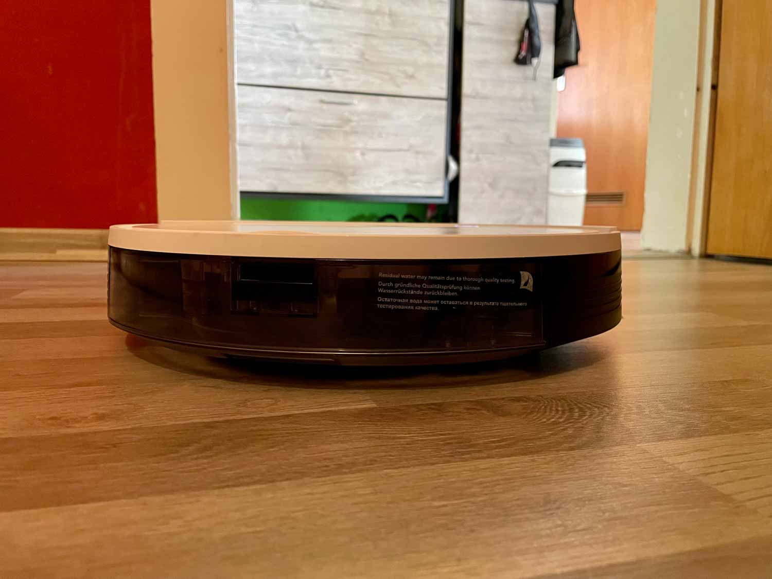 Bis auf einen, auf der Front verbauten, Bumper, der mit einer großen, schwarzen Kunststoffscheibe versehen ist, findet man nicht viel. Dahinter befinden sich Infrarotsensoren, die das Erkennen von Gegenständen und Wänden ermöglicht. Auf der Rückseite findet man den eingesetzten Wassertank. Seitlich gibt es noch ein paar Schlitze für die Abluft und dann war es das auch schon.