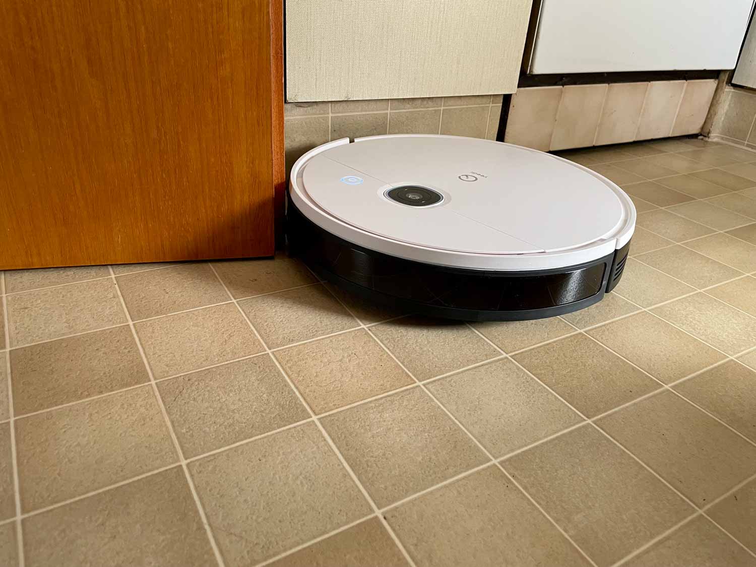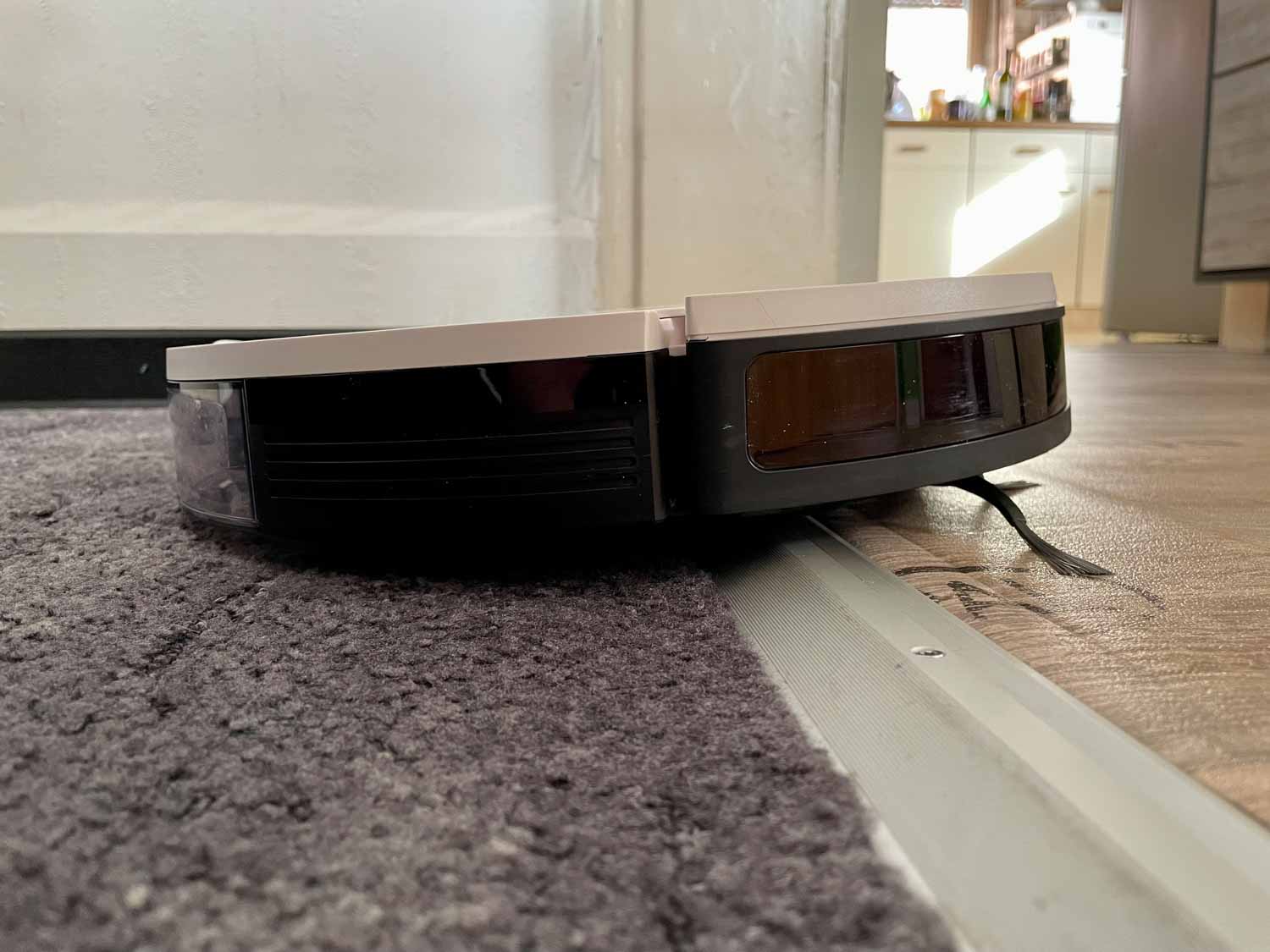 Durch die Infrarotsensoren im Bumper erkennt er, wenn ein Hindernis vor ihm liegt. Bei der S-förmigen Reinigung stoppt er auch zuverlässig vor Wänden und Möbeln und dreht in die nächste Spur ein. Wenn jedoch der Rand am Ende abgefahren wird, dann tastet er sich überaus viel mit seinem Bumper entlang. Dabei geht er sehr ruppig und teilweise grob fahrlässig mit aufkommenden Hindernissen um. Hat mir überhaupt nicht gefallen. Die auf dem Bumper angebrachte Gummilippe verhindert jedoch größere Schäden. Hindernisse wie Schuhe, Socken oder Kabel überfährt oder schiebt er zur Seite, ohne mit der Wimper zu zucken. Türschwellen überwindet er in meinem Haushalt alle zuverlässig.