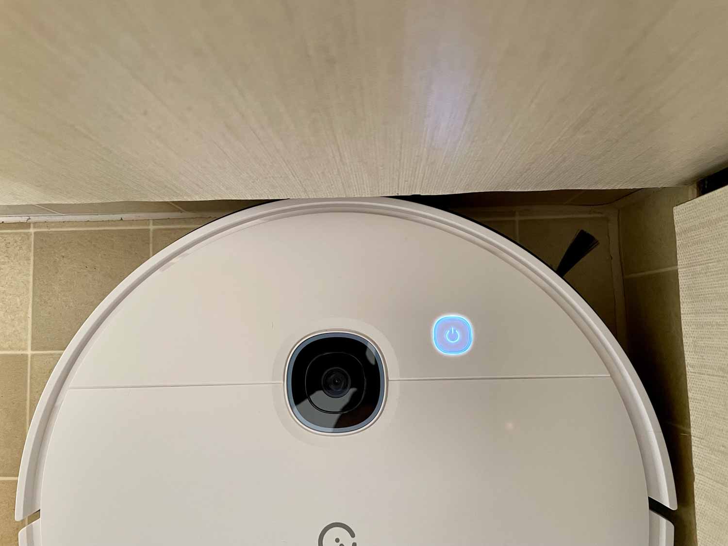 Man sehe und staune, da sitzt eine Kamera auf der Haube! Und ja, so ist es. Ein ToF-Sensor thront auf der Oberseite des yeedi vac station. Das ist nicht einfach eine Kamera, die Bilder von euch macht. Nein, das kann diese nämlich nicht. Was sie kann, ist das abtasten eurer Decke und damit passt der Roboter seine Navigation an. Hinter der Kamera befindet sich noch das yeedi Logo in Grau und daneben der Powerbutton, der es erlaubt, den Roboter zu starten, zu stoppen oder zur Ladestation zurückzuschicken.