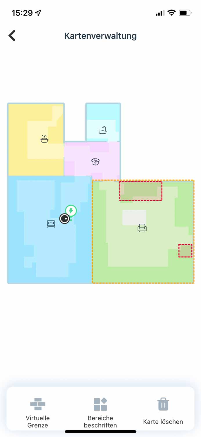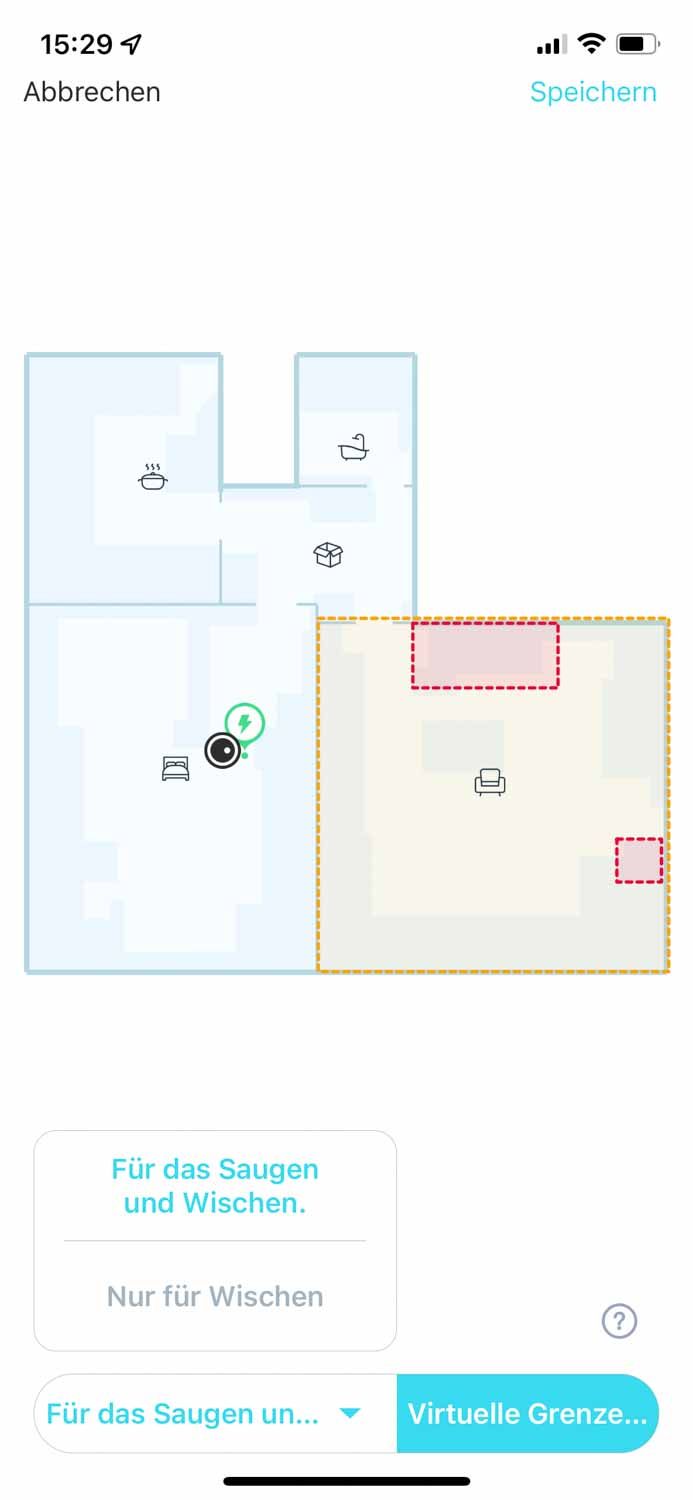 In der fertig erstellten Karte ist es möglich, mehrere Sperrzonen einzustellen. Dabei zeichnet man die Sperrzone einfach mit den Fingern in die Karte an die Stelle, an der die Zone sitzen soll. Jedoch stellt sich das, bei einer so groben Karte, als nicht so einfach heraus. Die Zonen können jedoch im Nachhinein manuell nochmals verschoben und angepasst werden. Diese Zonen befährt der Roboter zukünftig nicht mehr. Auch eine Nichtwischzone ist einstellbar.