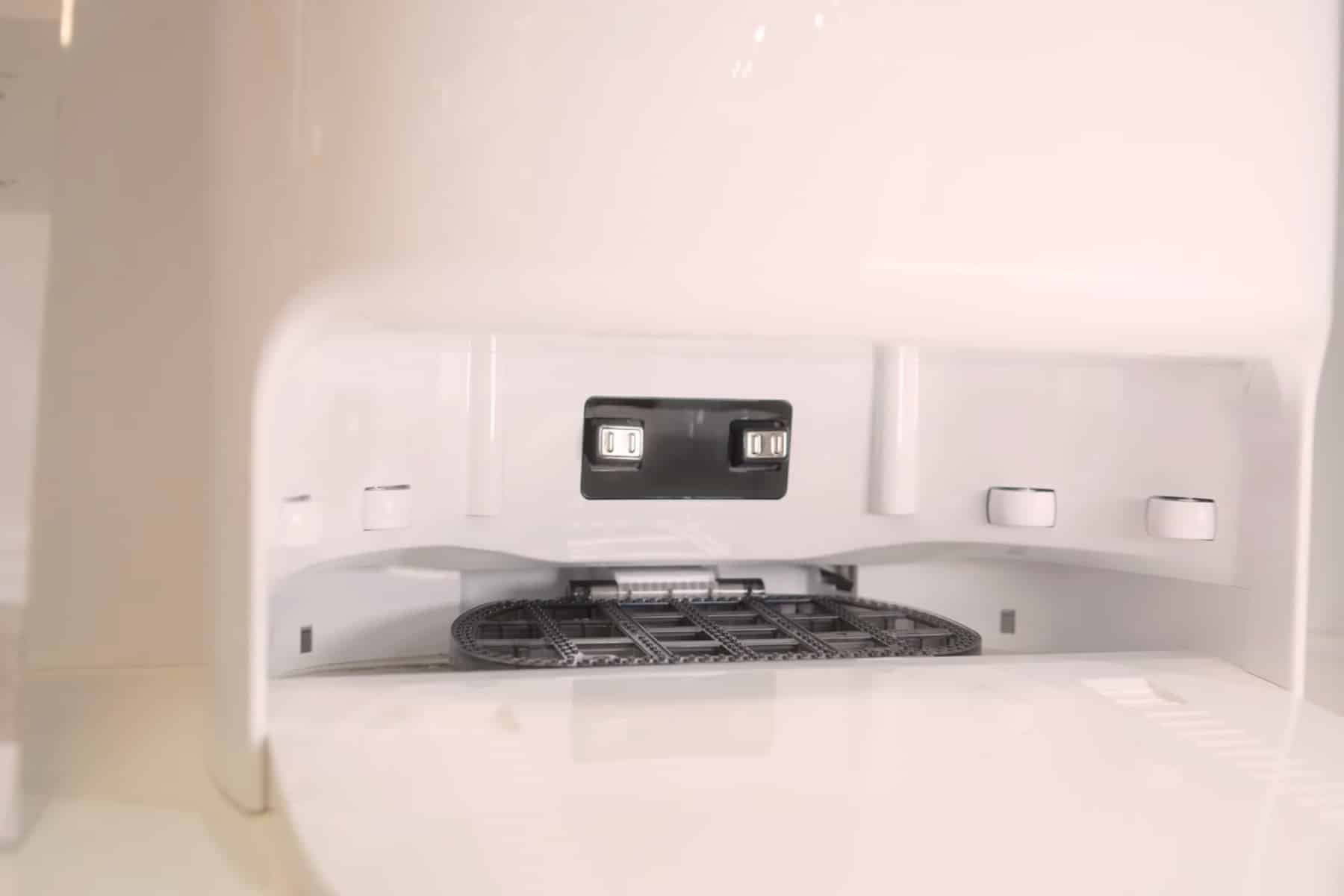 Die mitgelieferte Waschstation wäscht während und nach jeder beendeten Reinigung das Wischpad wieder sauber. Dafür enthält die Station eine Rüttelplatte mit Noppen, die sich hin und her bewegt, während frisches Wasser auf das Wischtuch gegeben wird. Ein großer Frischwassertank, der im oberen Bereich der Station sitzt, sorgt für stetigen Frischwasserzufluss auf das Wischpad. Nach und auch während der Reinigung wird das abgewaschene Schmutzwasser in einen ebenso großen Schmutzwassertank abgepumpt. Ob das Gerät eine anschließende Trocknungsfunktion des Wischpads mittels Heißluft besitzt, konnte ich noch nicht herausfinden. Über die Station selbst lässt sich der Roboter übrigens auch starten, stoppen oder zur Reinigungsstation zurückschicken.