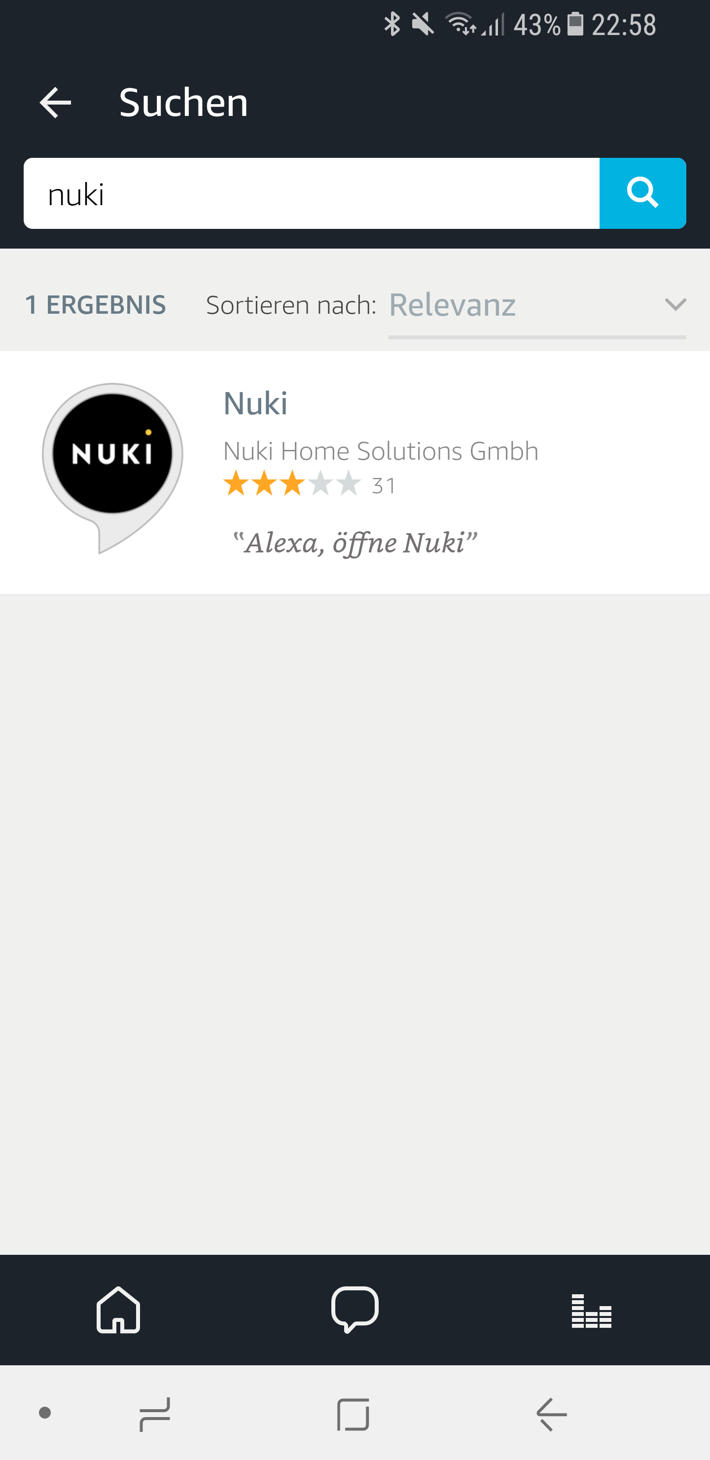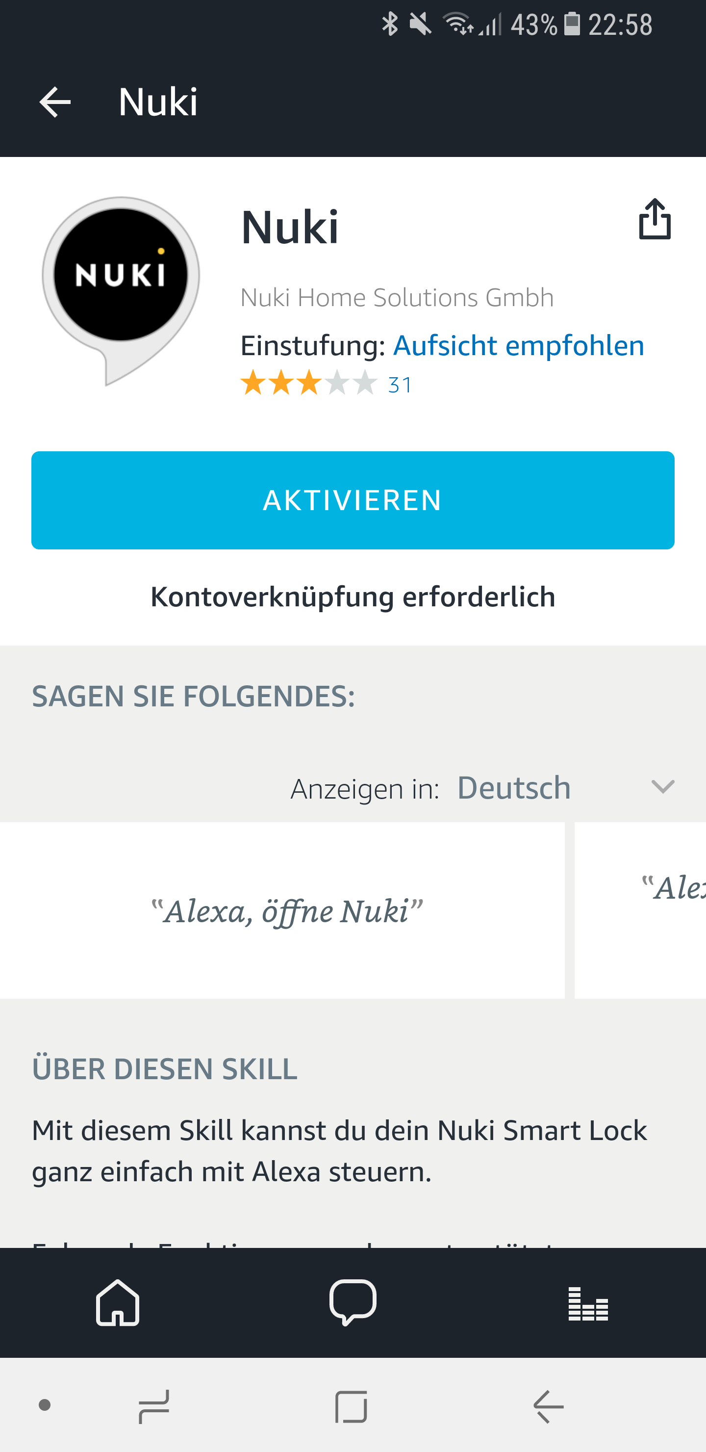 Ich finde es prinzipiell toll, dass Nuki einen Skill anbietet, der auch gut und zuverlässig funktioniert. Dennoch wäre es wünschenswert, eine erweiterte Funktionalität zu haben. So kommt man mit den gegebenen Mitteln nicht sehr weit und ist fast schon gezwungen, den Weg über ioBroker und IFTTT zu gehen. Wenigstens eine Einbindung in eine Routine zum Abschließen der Tür wäre schön. Evtl. wird das ja noch nachträglich integriert?!?