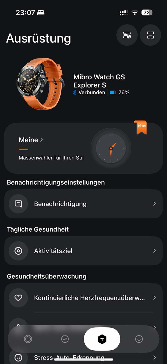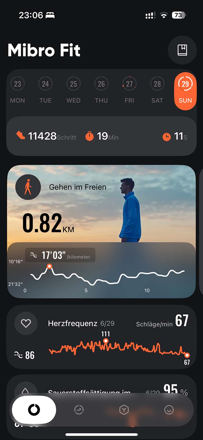 Die Uhr verbindet sich per Bluetooth mit der Mibro Fit App (iOS/Android). Diese ist optisch gelungen, bietet aber weniger Tiefe als andere Hersteller. Trainingsergebnisse, Vitalwerte, Schlafphasen und Routen sind gut aufbereitet. Die Synchronisierung erfolgt automatisch und zügig. Auch der Export der Daten mit Apple Health ist problemlos möglich.