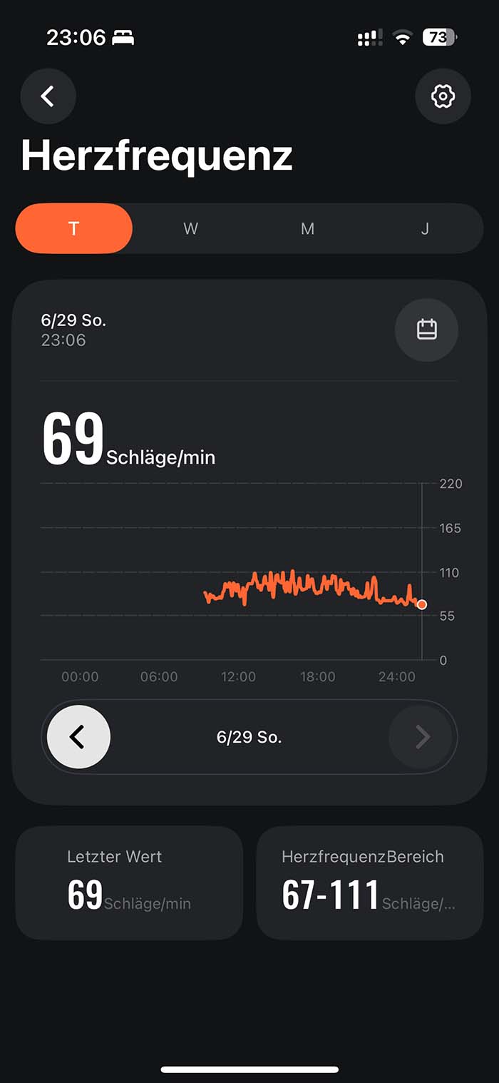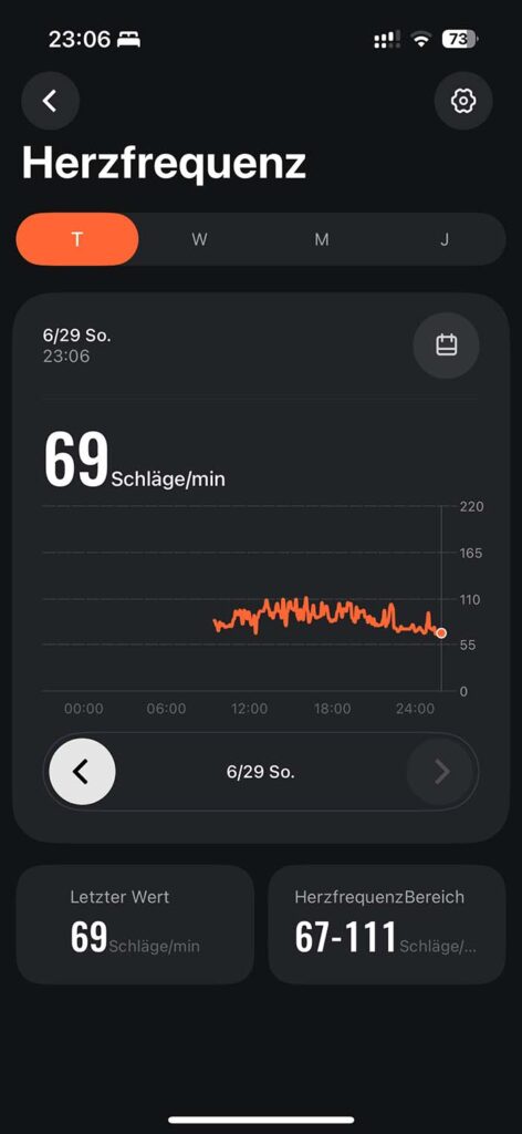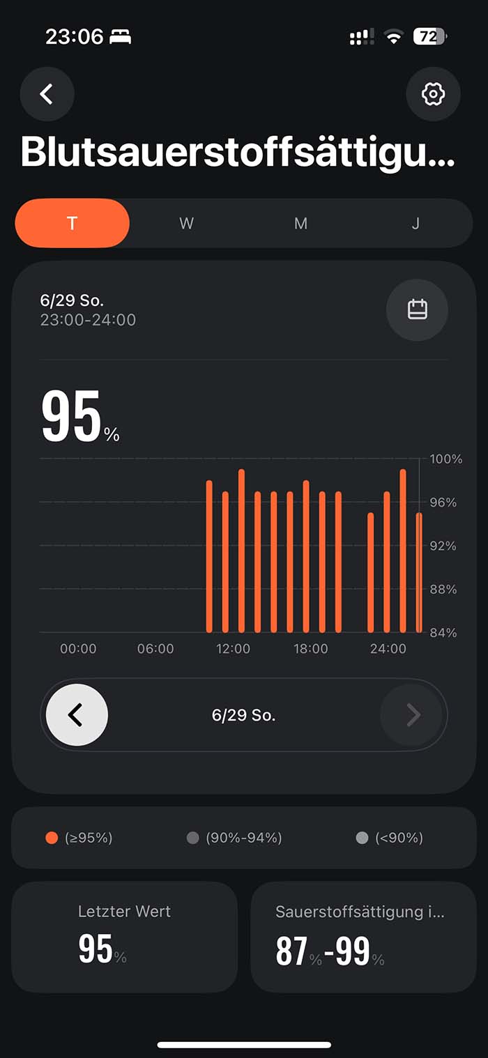 Auch im Alltag überzeugt die Sensorik. Die Uhr kann permanent den Puls messen, erkennt automatisch die Ruheherzfrequenz und liefert SpO₂-Messungen (Sauerstoffsättigung). Hier kann man auch einstellen, ob die Werte permanent oder in zeitlichen Abständen gemessen werden sollen, was sich natürlich auf die Akkulaufzeit auswirkt. Die Werte sind aus meiner Sicht plausibel und stimmen mit denen meiner Apple Watch überein.