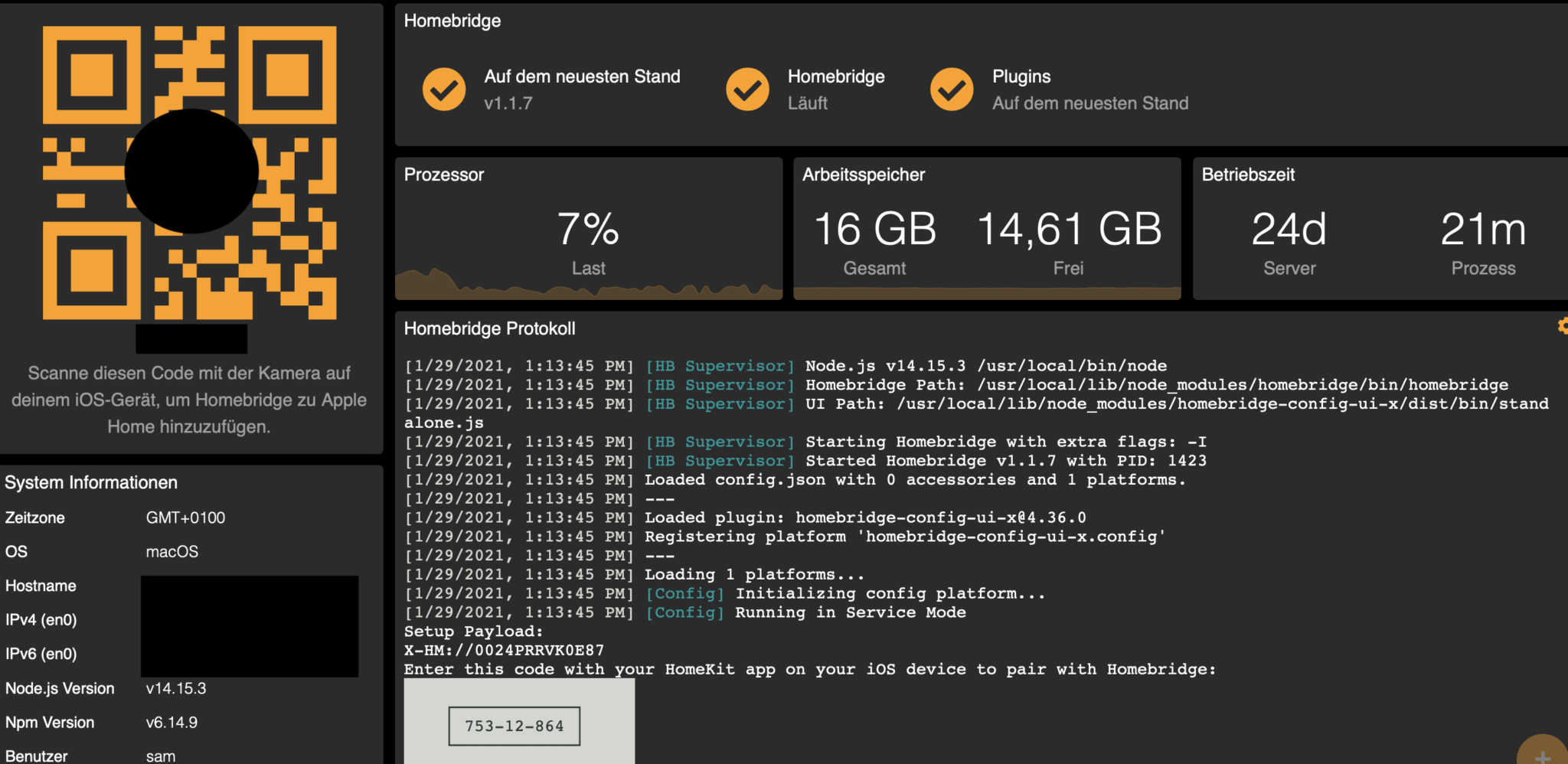 Ihr habt hier die Möglichkeit einen QR-Code einzuscannen und die Homebridge in euere Home-App einzufügen. Außerdem könnt ihr verschiedene Plug-Ins installieren, um SmartHome-Geräte in euer HomeKit einzubinden.
