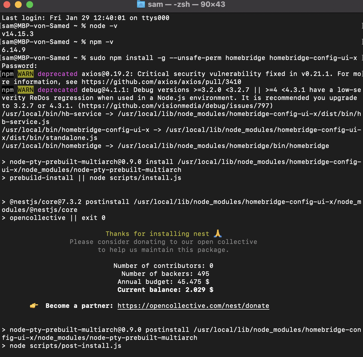Auch hier werdet ihr nach dem Passwort gefragt. Einfach eingeben und schon ist die Installation von Homebridge fertig. Die Homebridge config.json befindet sich unter ~/homebridge.