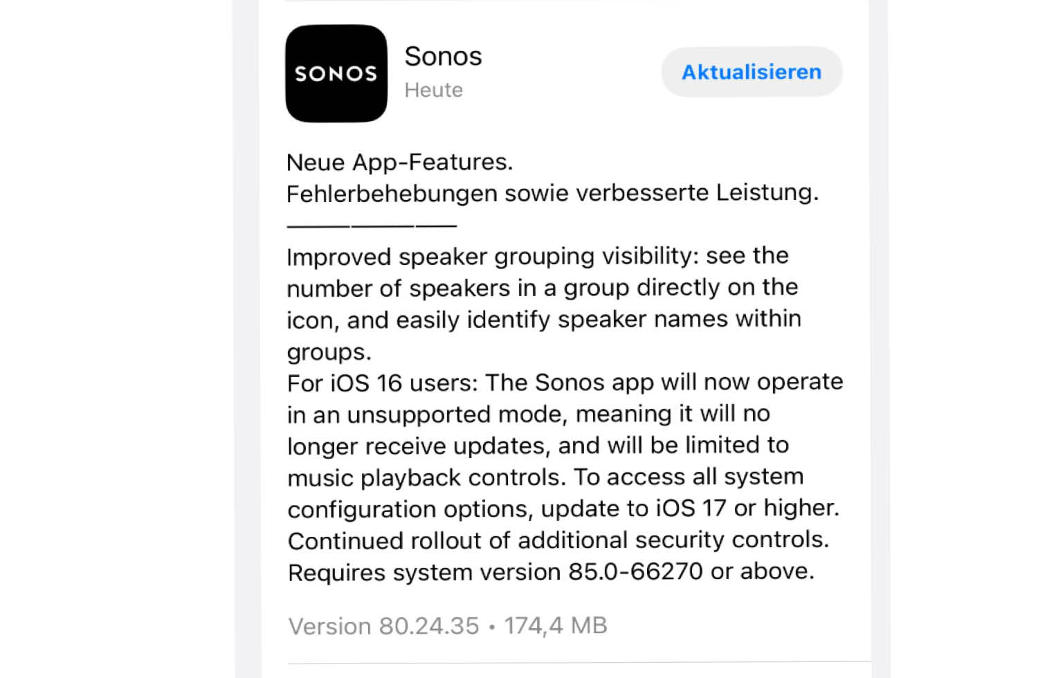 Das neue Update ist sowohl für iOS als auch für Android verfügbar. Auf iOS‑Geräten hat das Update den Namen 80.24.35. Bei Android lautet die Nummer 80.24.32. Das Update beinhaltet die Verbesserung der Lautsprecher-Icons und der Gruppierung der Lautsprecher. Durch Icons wird nun angezeigt, welcher Lautsprecher ausgewählt ist, und die Anzahl der Lautsprecher wird durch eine Zahl angezeigt.