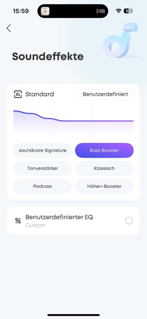In der App hat man die Möglichkeit, verschiedene Soundprofile zu nutzen, und auch ein benutzerdefinierter Equalizer ist möglich. Beim sogenannten Bass Booster habe ich jedoch keinen großen Unterschied bei elektronischer Musik wahrnehmen können.