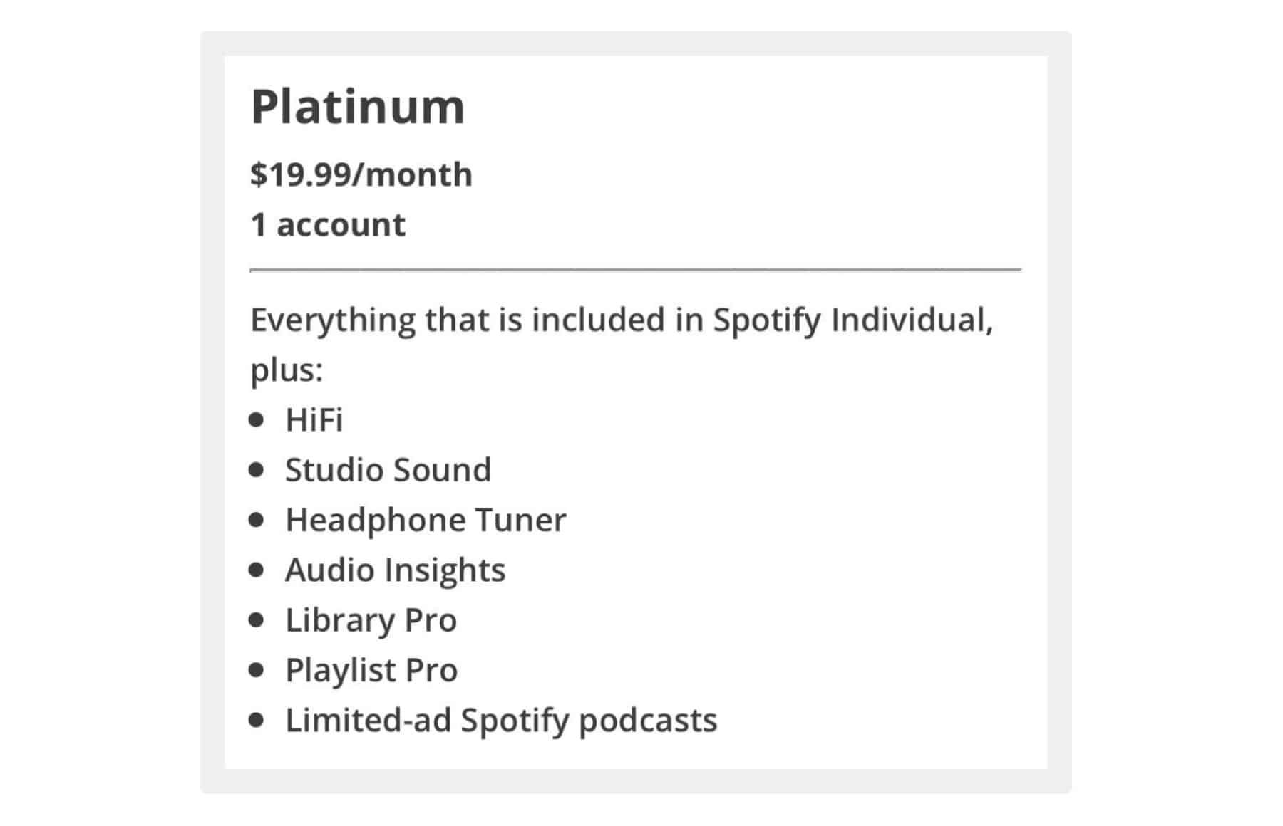 Spotify hat jetzt eine Umfrage an einen User in den USA gestellt und ein neues Patinum-Abo gezeigt. Die Frage dazu war, ob sich der User, der zu Apple Music gewechselt ist, auf ein neues Abo-Modell einlassen würde. Das Platinum-Abo ist ein Ein-Mann-Abo und soll stolze 19,99 $ pro Monat kosten und beinhaltet Features wie HiFi, Studio Sound, Headphone Tuner, Audio Insights, die Library Pro und Playlist Pro, sowie Limited-ad Spotify podcasts. Damit bietet Spotify zahlreiche neue Funktionen im Platinum-Abo an, da allein eine HD-Option nicht mehr den teuren Preis rechtfertigen würde. Wir sind gespannt, wie die Zukunft aussieht.