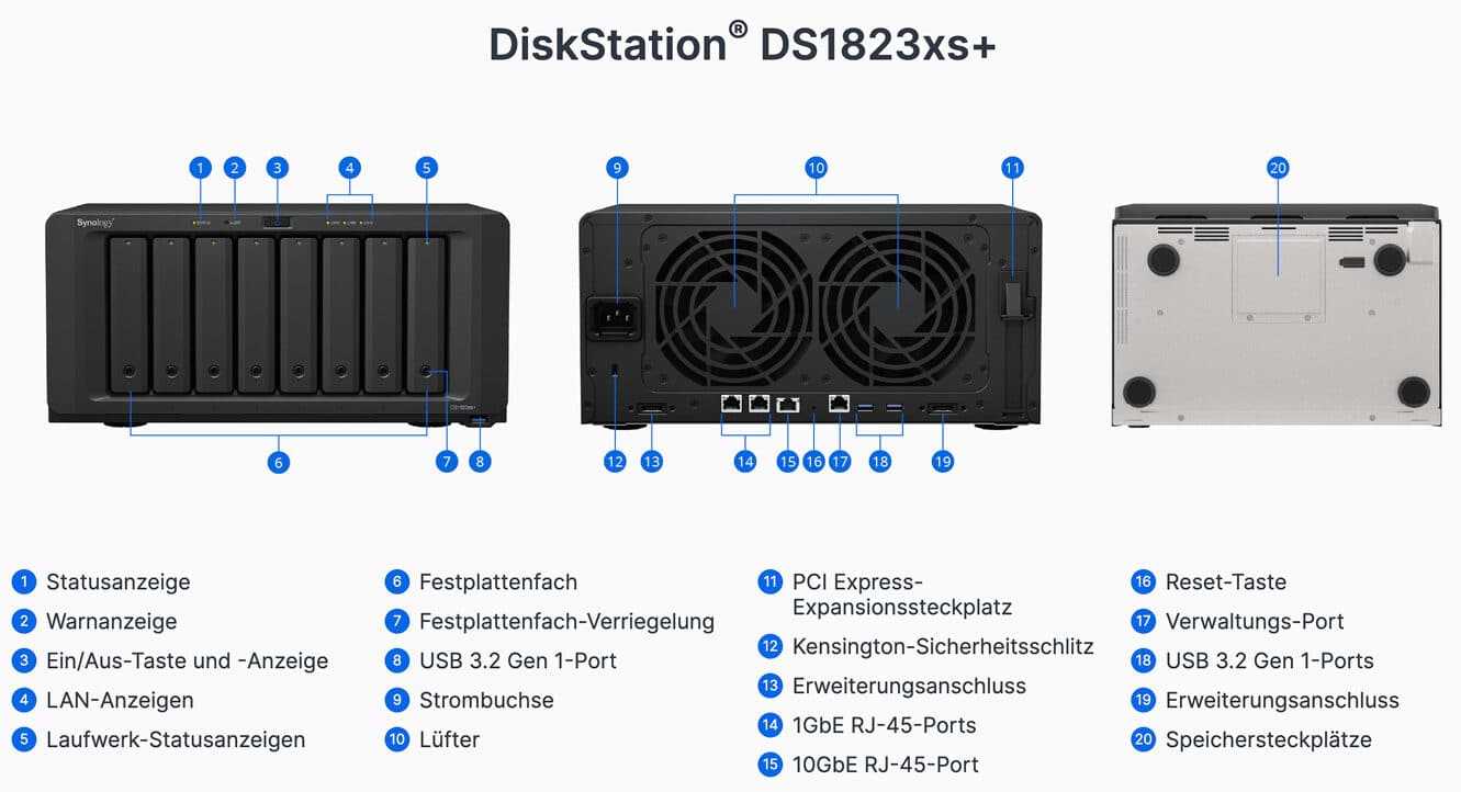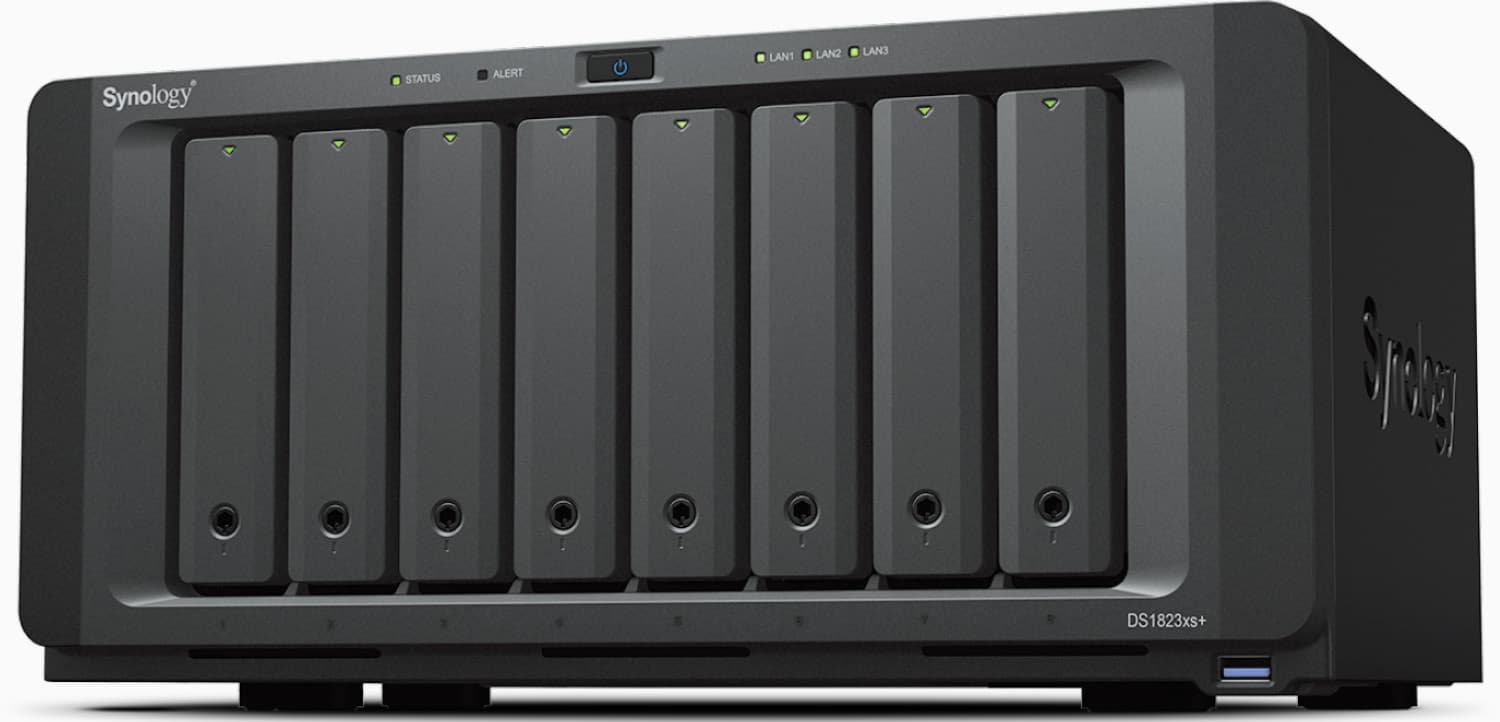 Das neue NAS-Modell DS1823xs+ ist mit 166 x 343 x243 mm recht kompakt und bietet dennoch bis zu 8 Festplatteneinschübe und 2 NVMe-SSD-Steckplätze. Ausgestattet mit einem AMD Ryzen V1780B, wird genügend Leistung erzeugt, um allen Anforderungen gerecht zu werden. Ab Werk verbaut das Unternehmen 8 GB Arbeitsspeicher, der auf bis zu 32 GB aufgestockt werden kann. Über zwei Expansionsanschlüsse lassen sich zudem die Laufwerke auf 18 Stück aufrüsten.